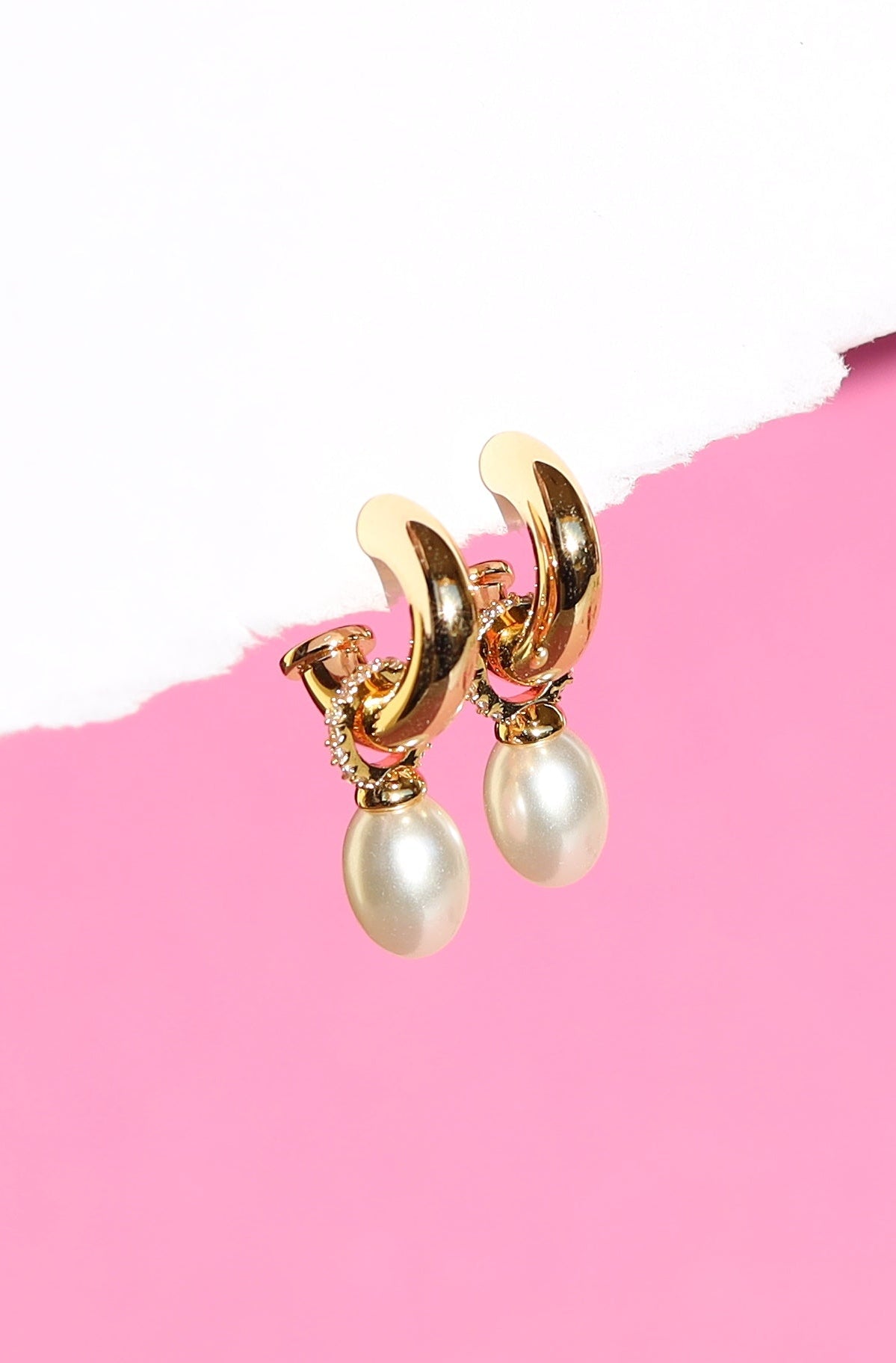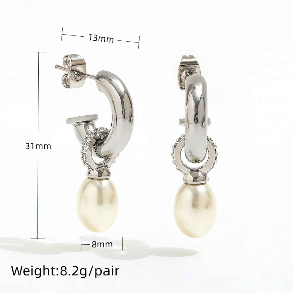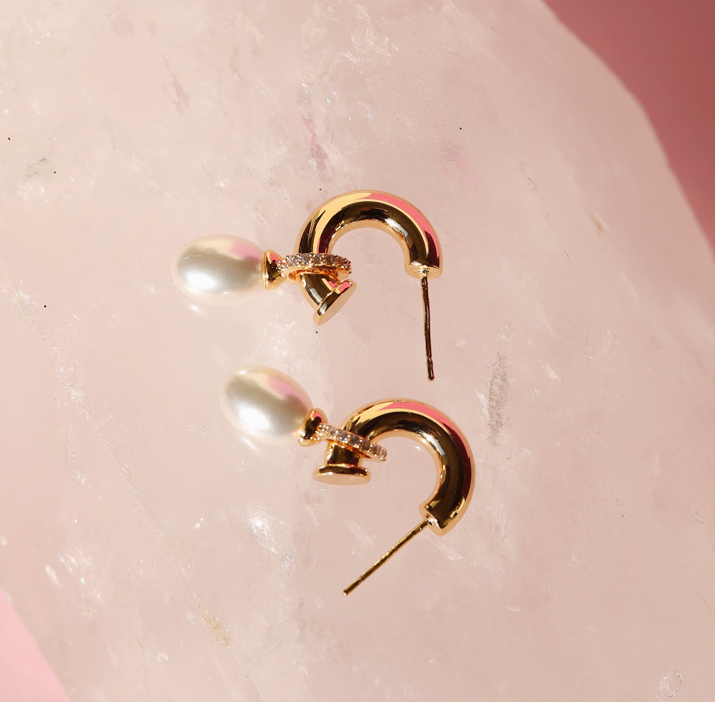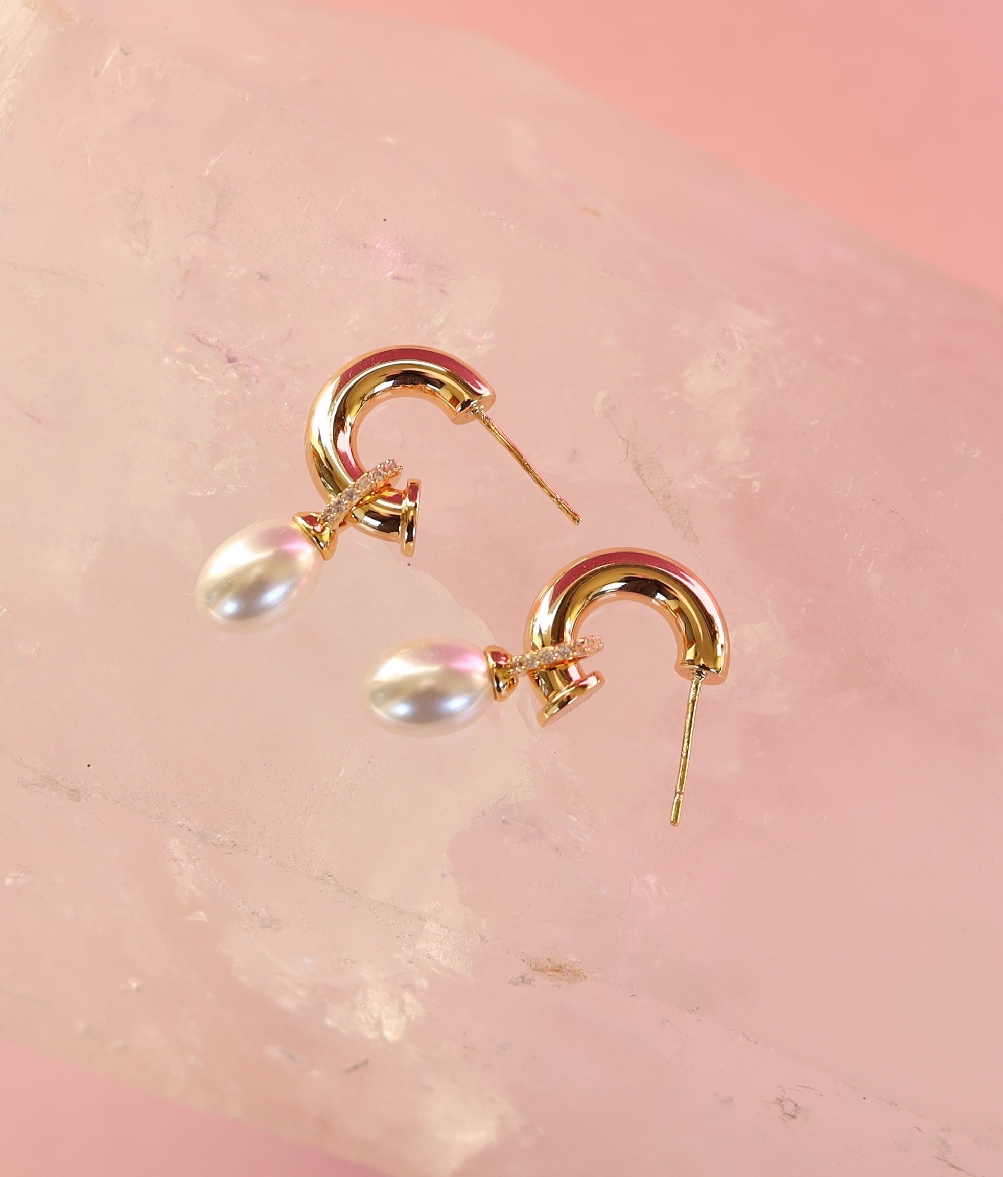 Abel - Pearl Drop Earrings with a polished finish and adorned with a sparkling high quality cut Zircon imitation pearl charm. Perfect simple modern jewelry. Thick chunky design goes well with retro vintage style to model simple minimal outfits.