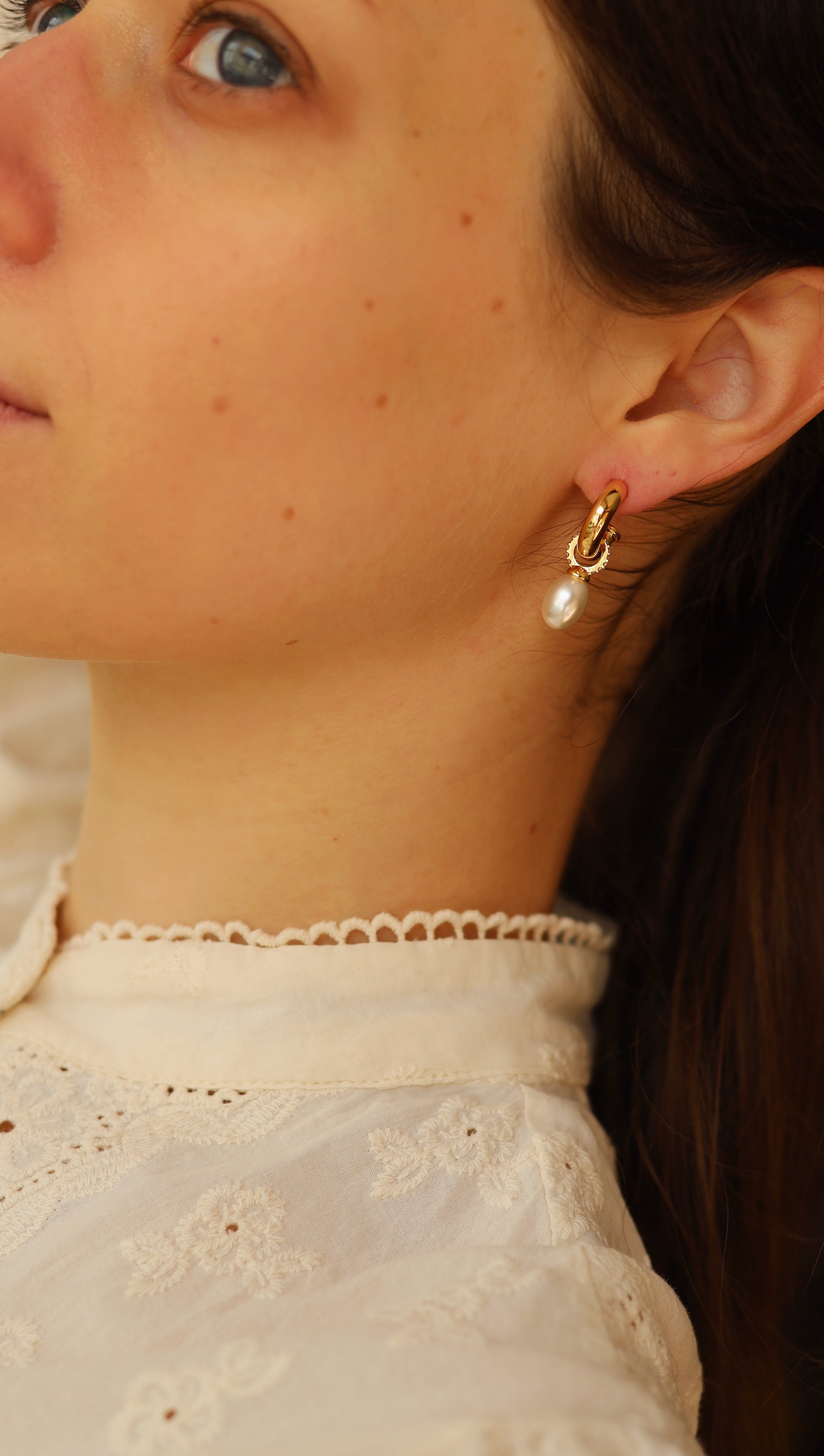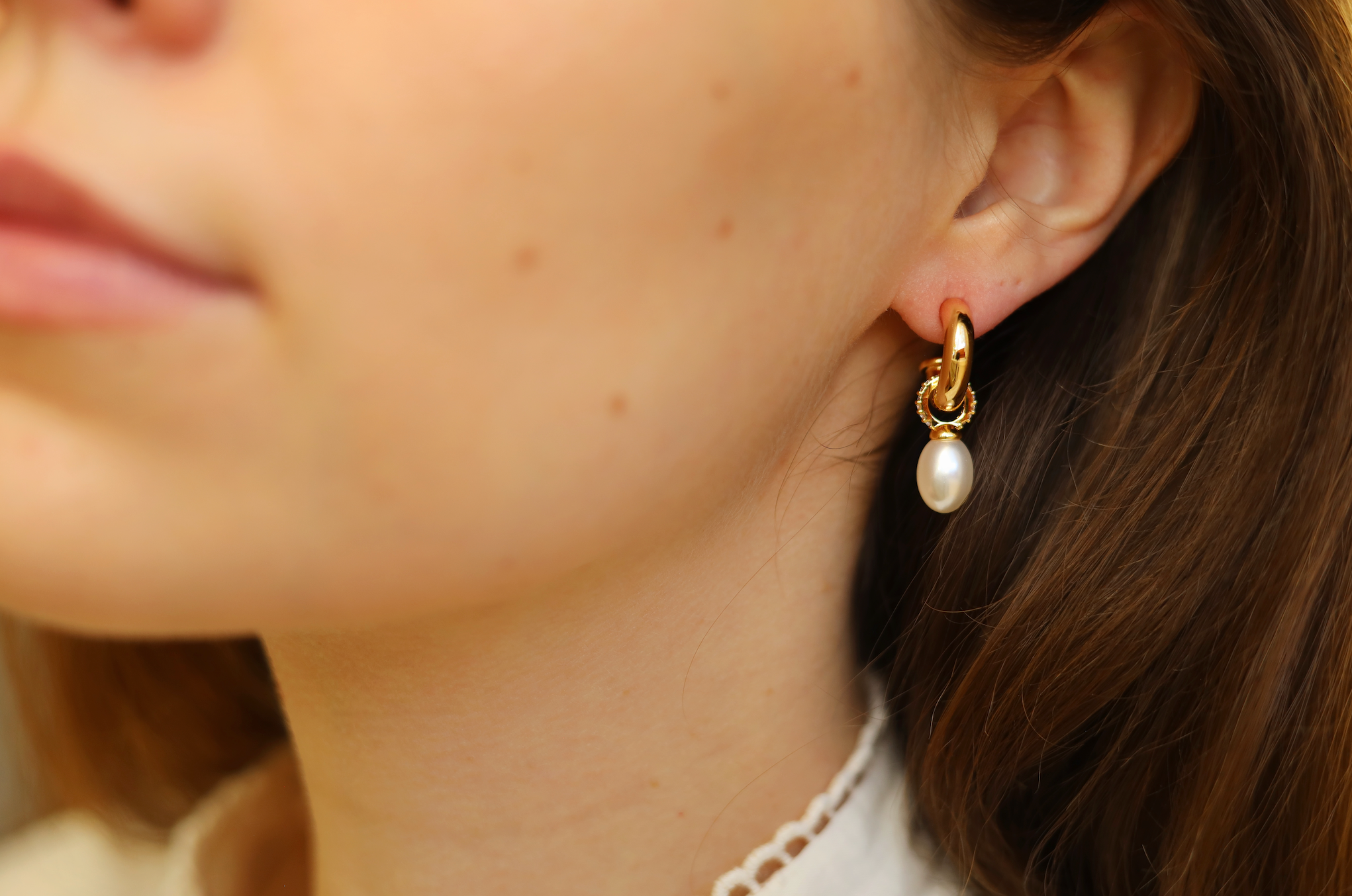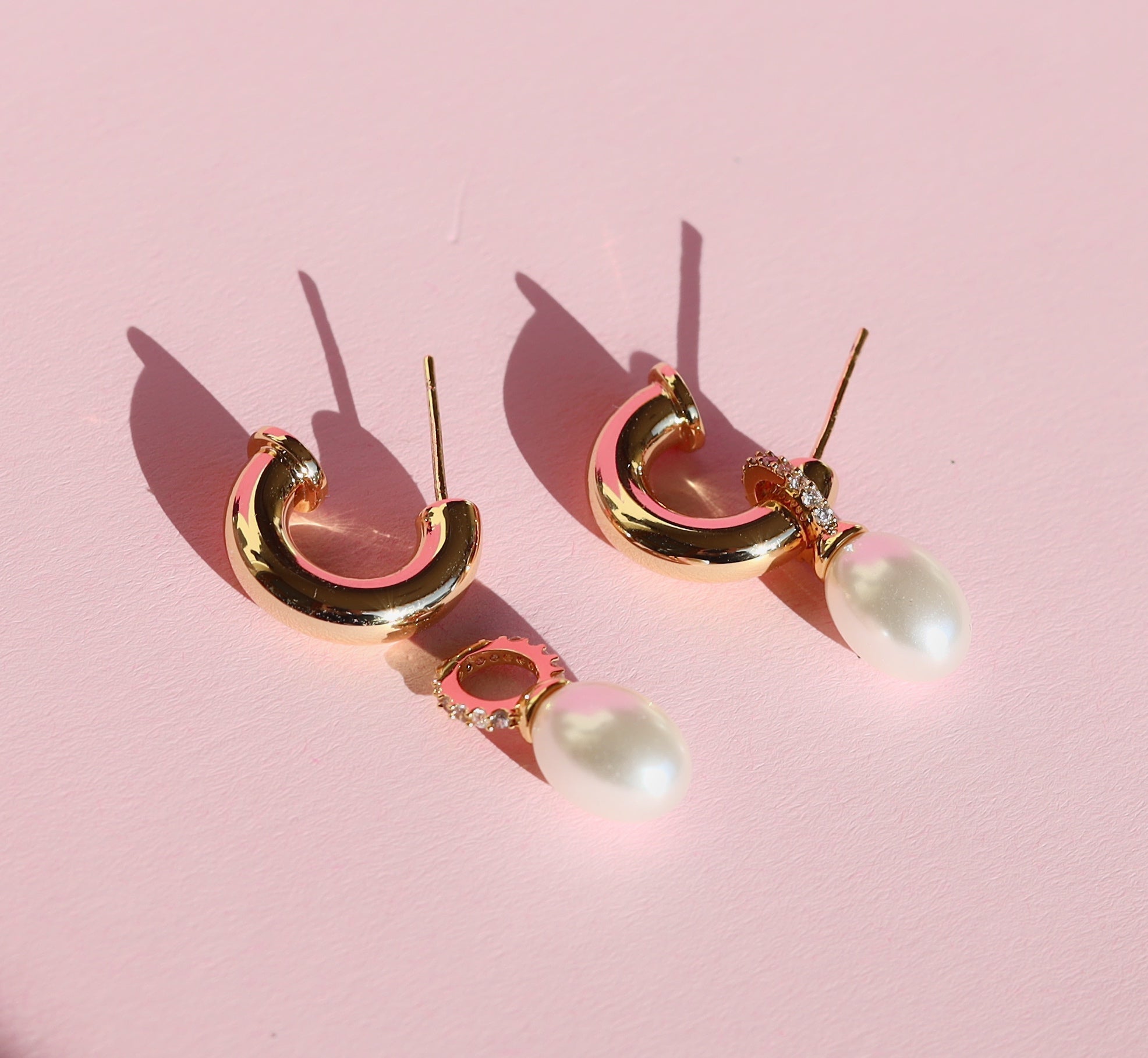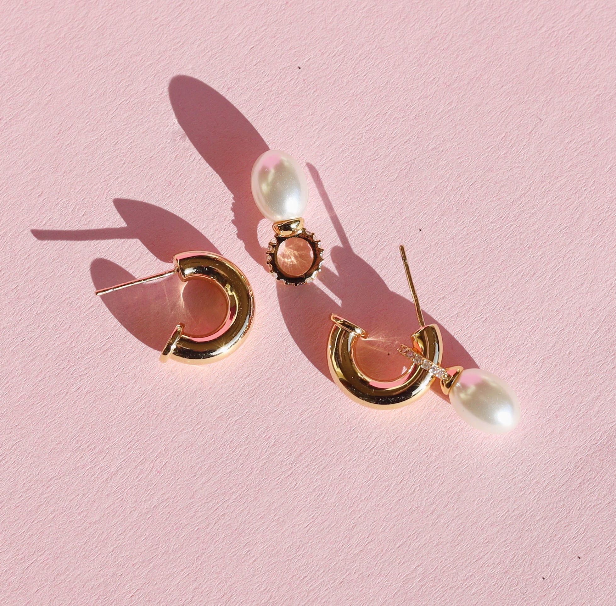Abel - Pearl Drop Earrings with a polished finish and adorned with a sparkling high quality cut Zircon imitation pearl charm. Perfect simple modern jewelry. Thick chunky design goes well with retro vintage style to model simple minimal outfits.