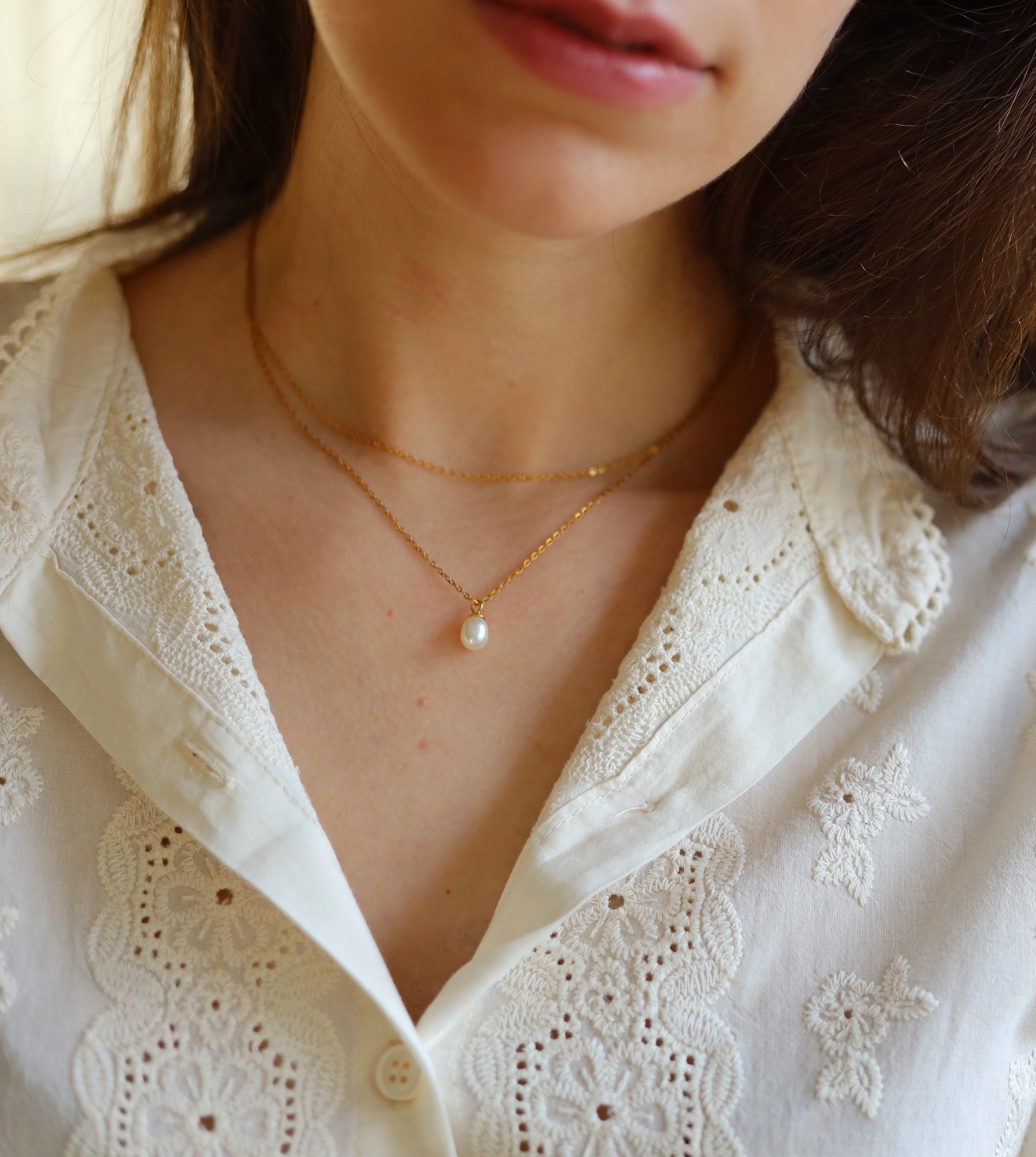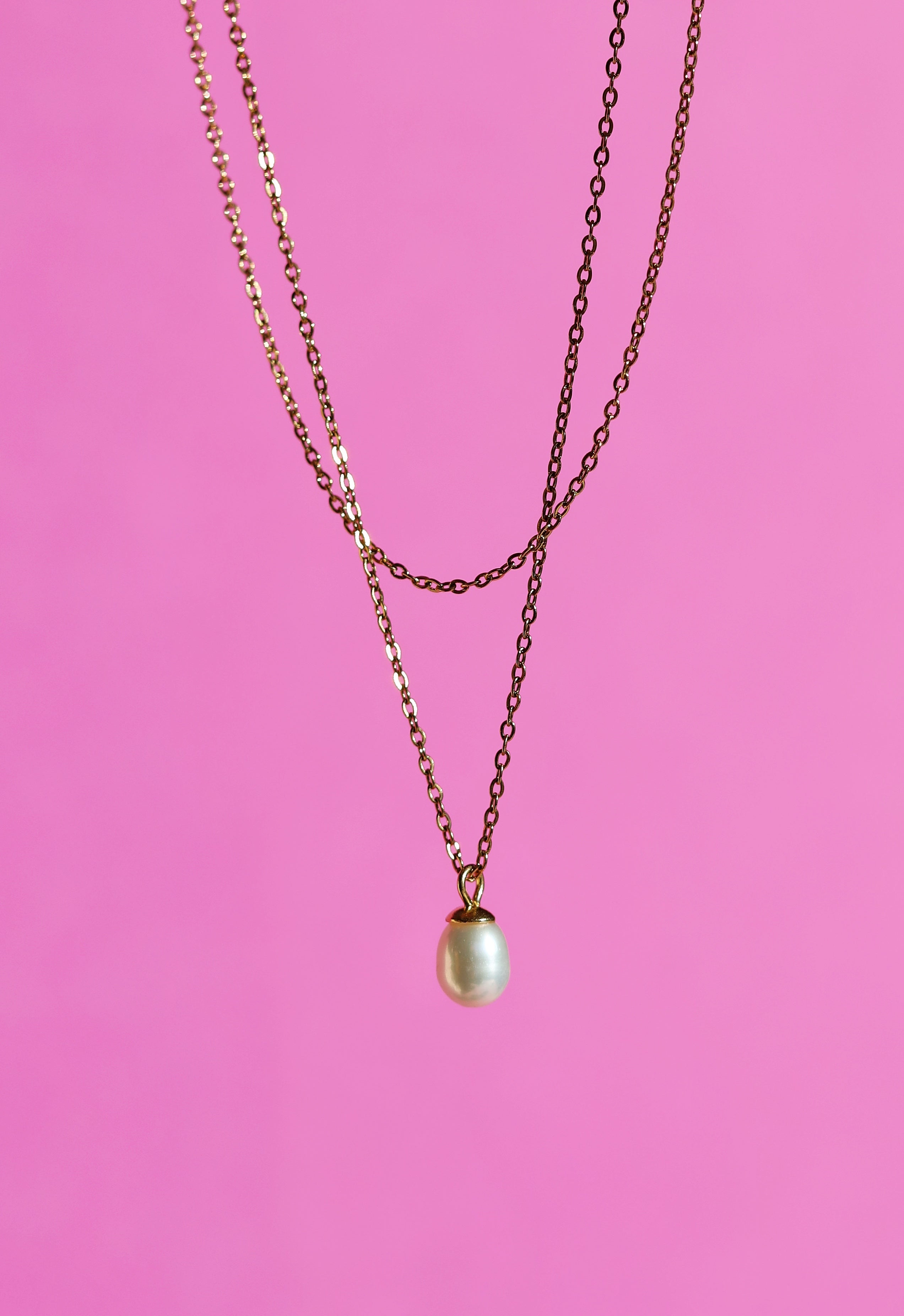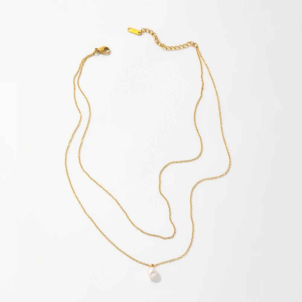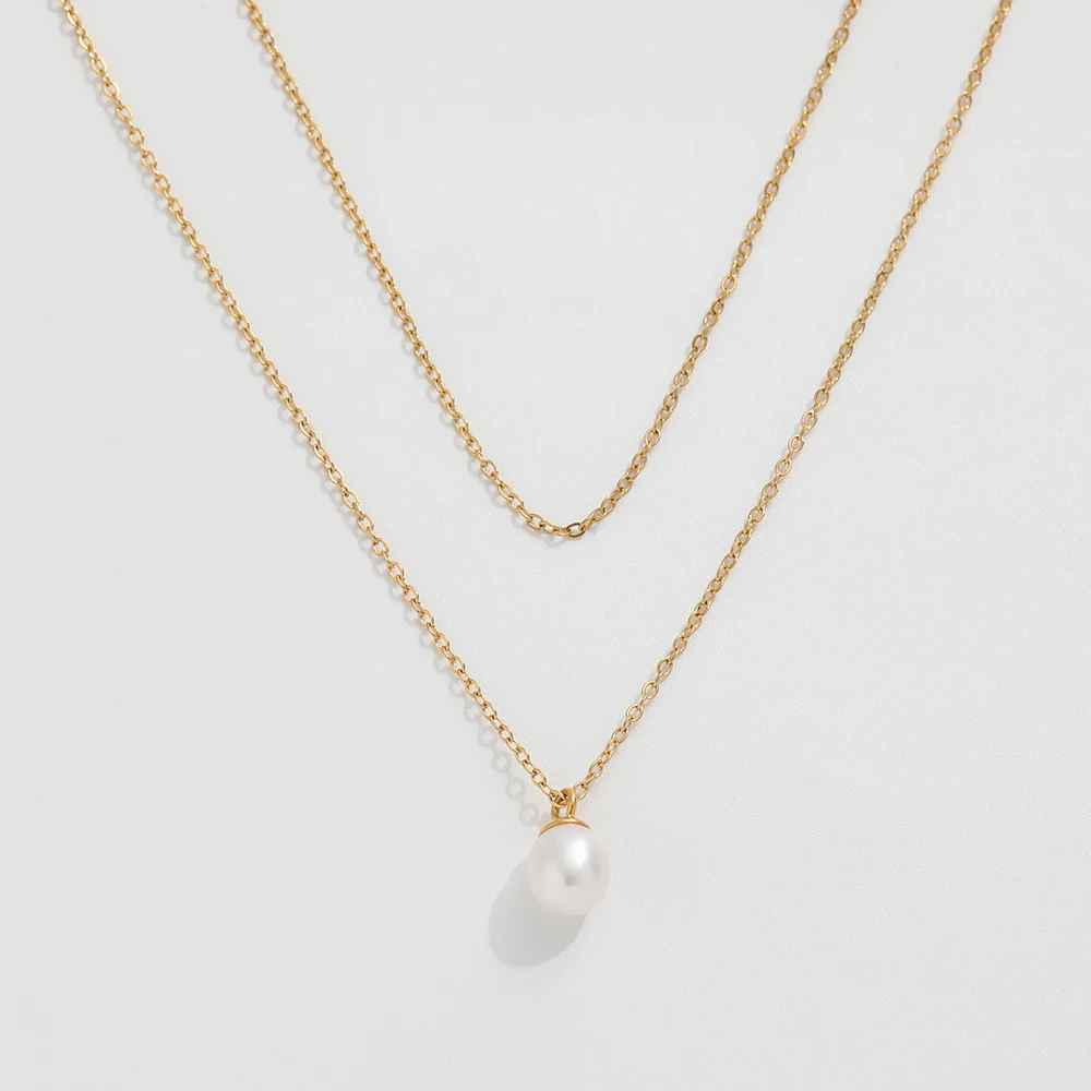 This double layer dainty pearl necklace consists of 2 necklaces. The fiagro chain necklace with a single freshwater pearl pendant hanging at the center front.
