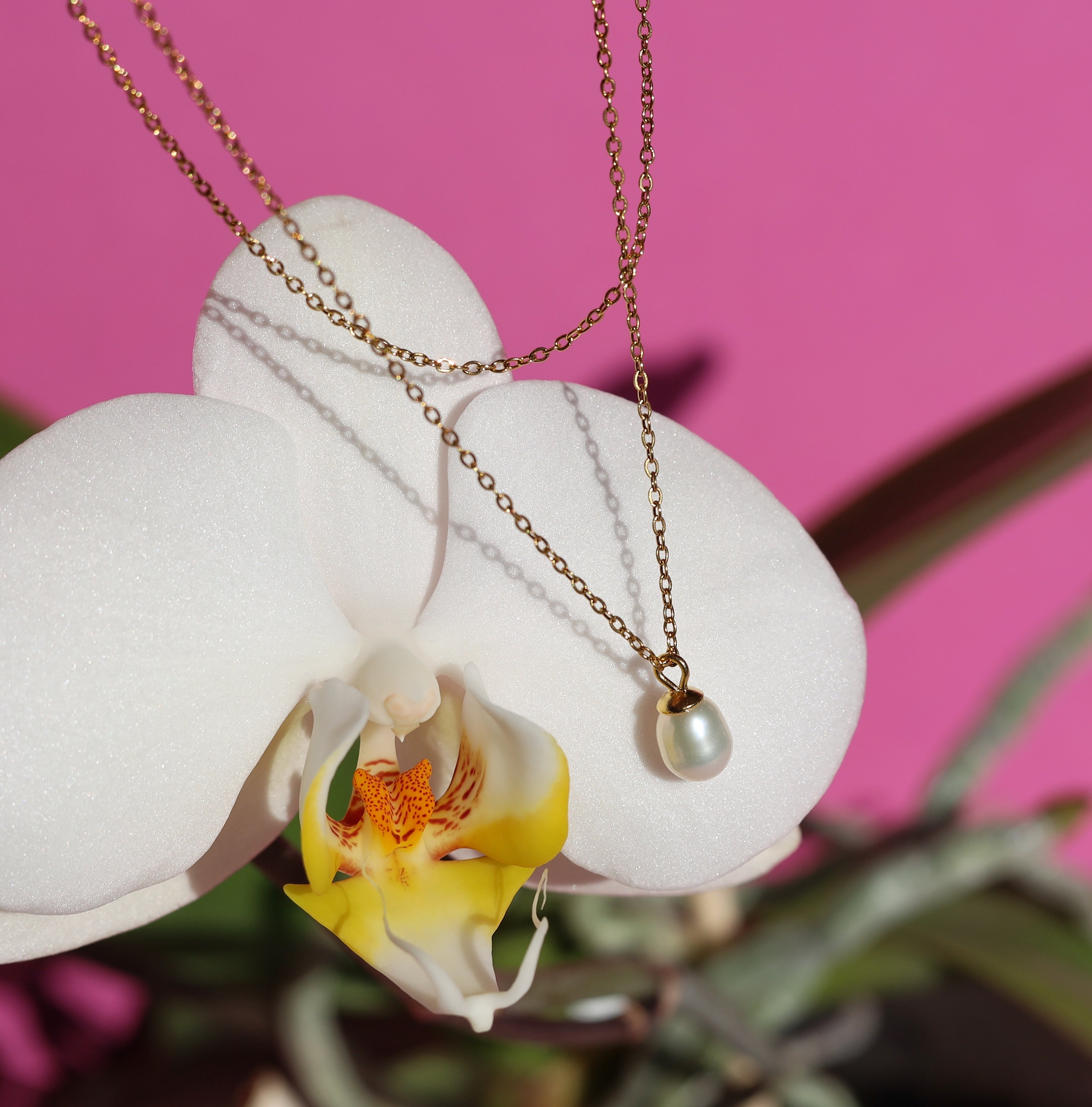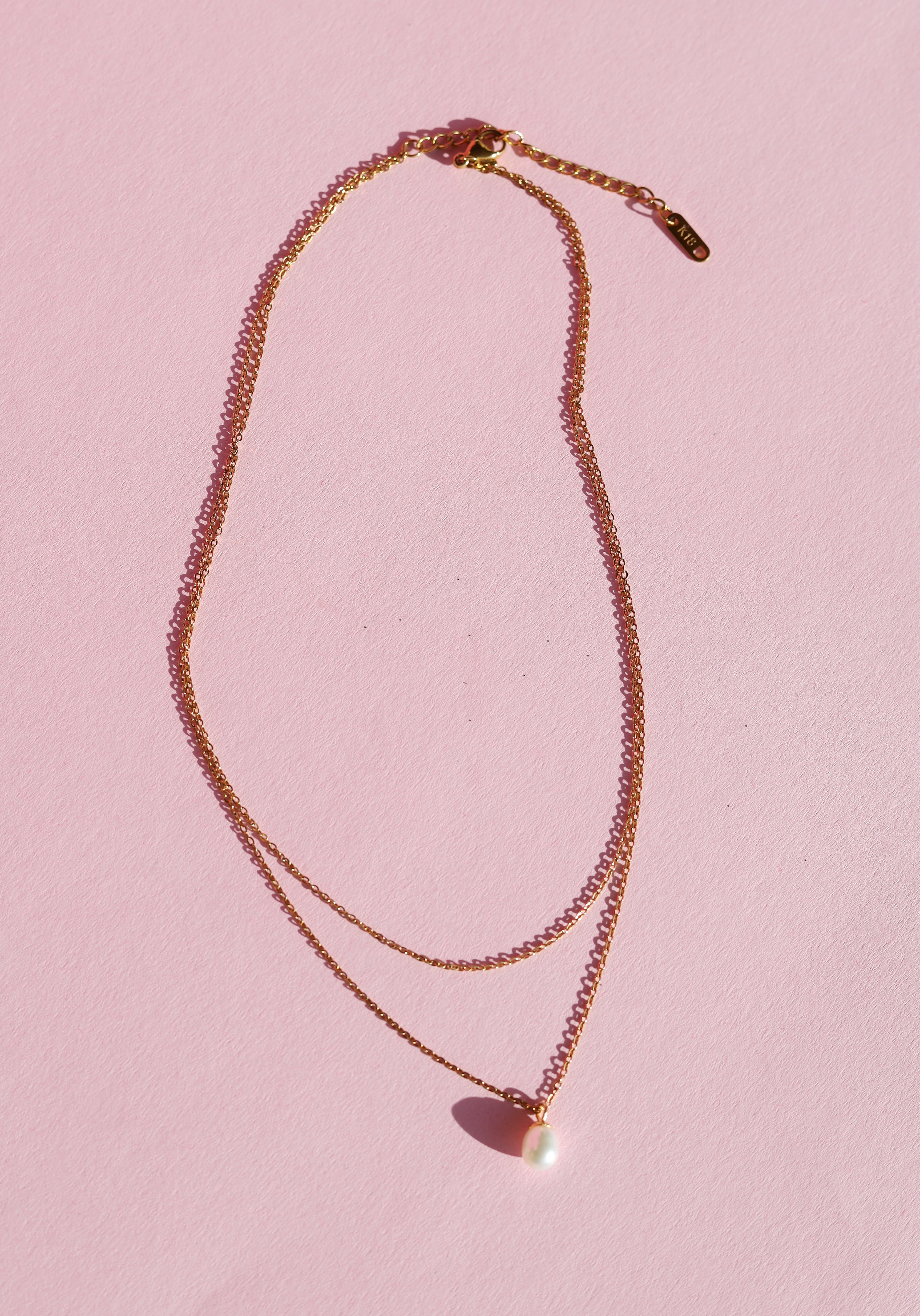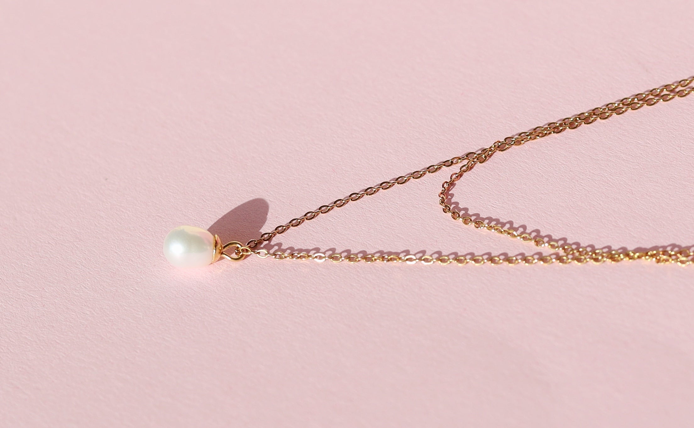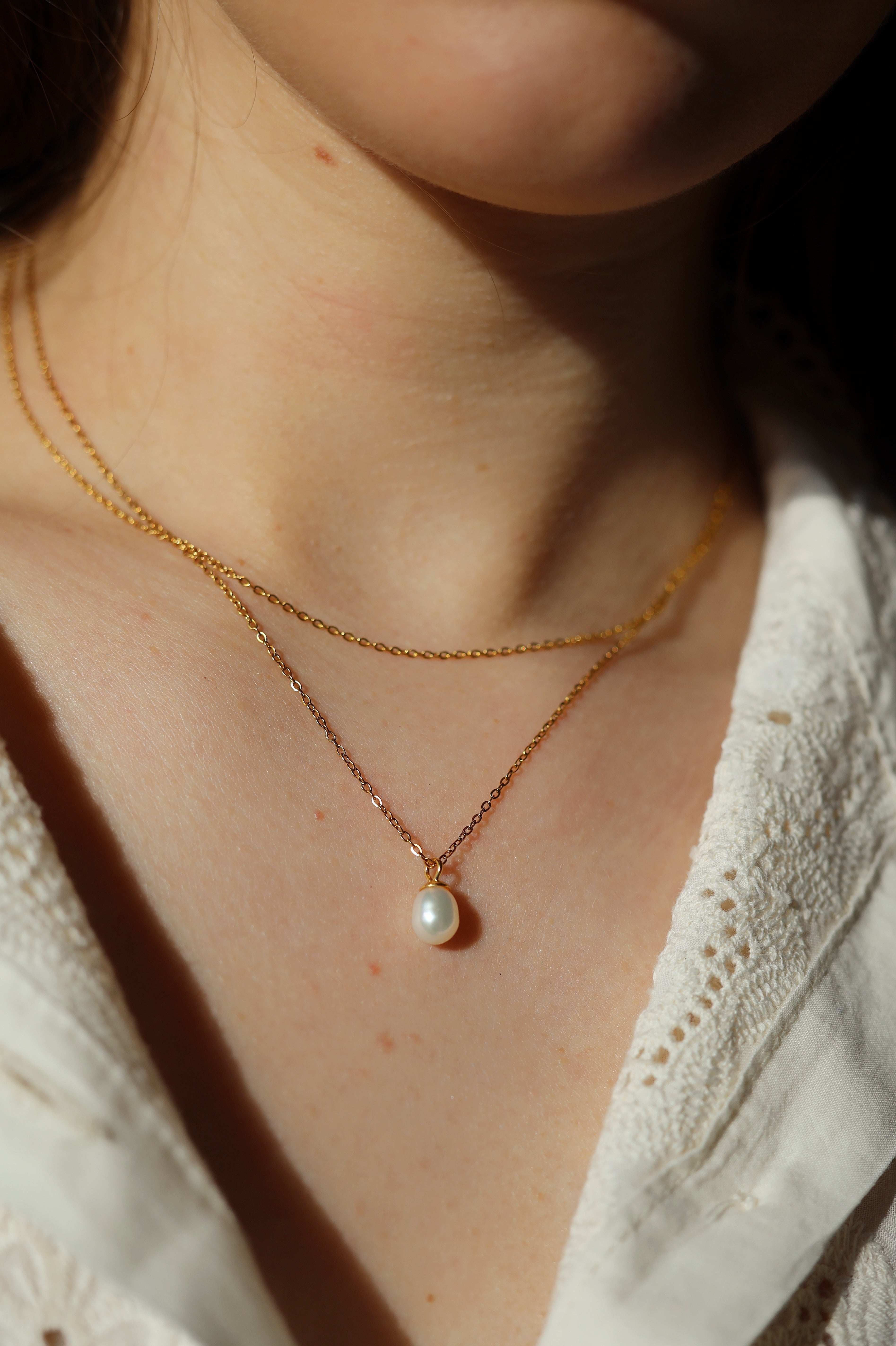 This double layer dainty pearl necklace consists of 2 necklaces. The fiagro chain necklace with a single freshwater pearl pendant hanging at the center front.