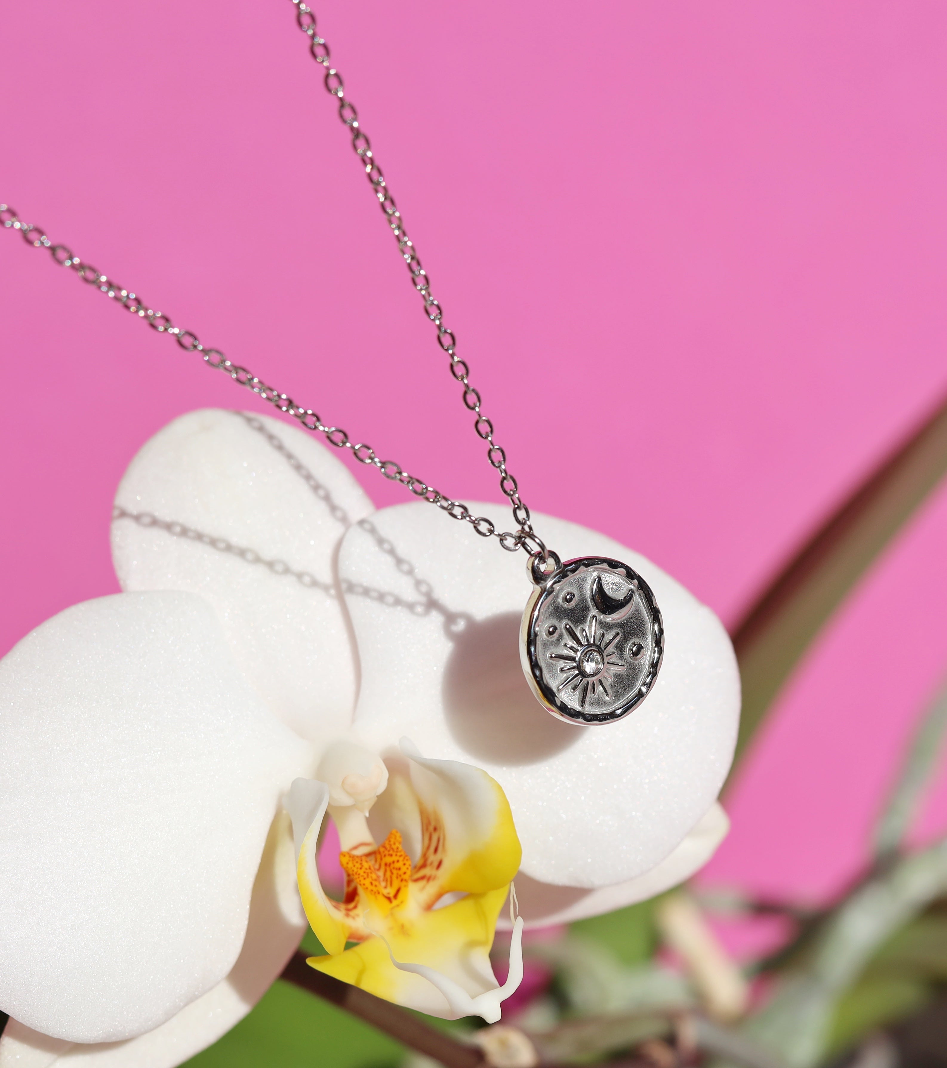 Magdolna's Sun and Moon Pendant Necklace is a dainty pendant necklace that features a small, gleaming gold and silver pendant depicting both the sun and moon, accented with a clear crystal stone in the center of the sun.