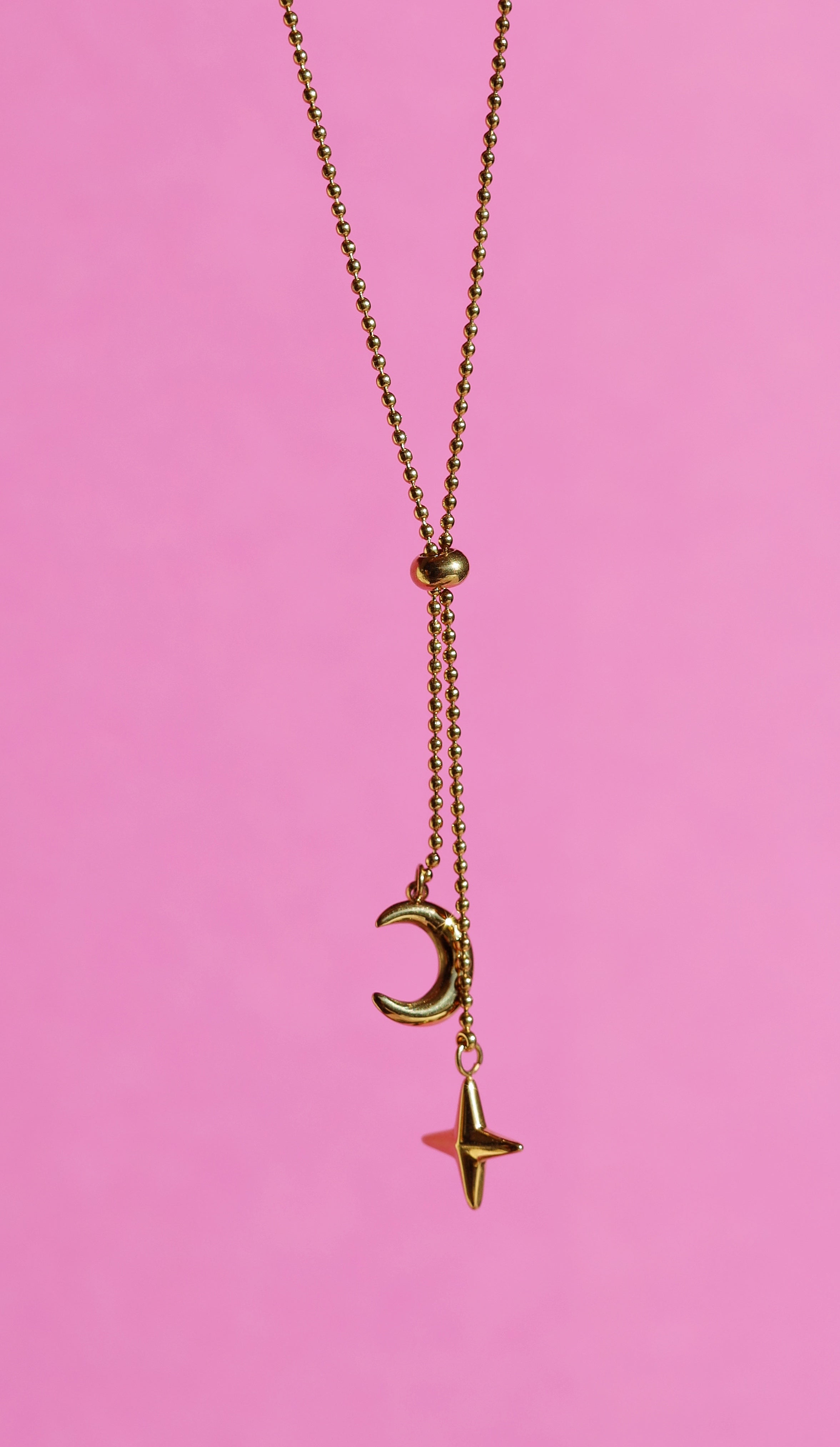 Velli - Sun and Moon Beaded Zip Necklace is a dainty necklace that features a gold gleaming sun and moon dangling from an adjustable beaded gold chain.