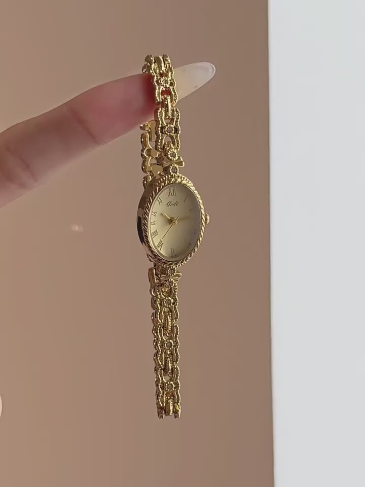 Style your wrist with the Arnela oval gold and silver vintage women's watch, featuring a ornamental strap with gleaming crystals. The classic oval dial and elegant strap combine to create a luxurious yet wearable timepiece.