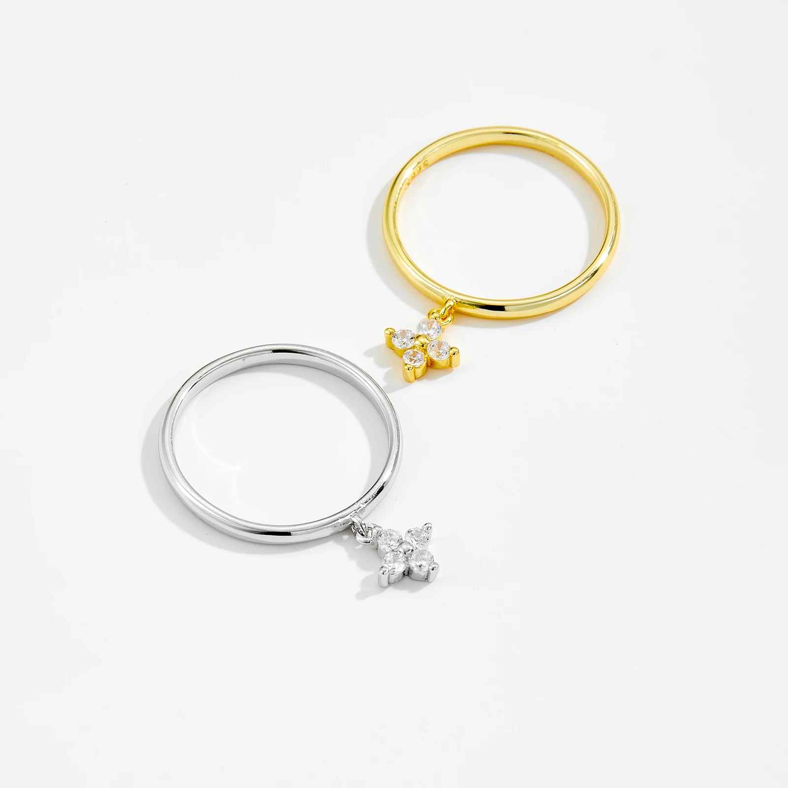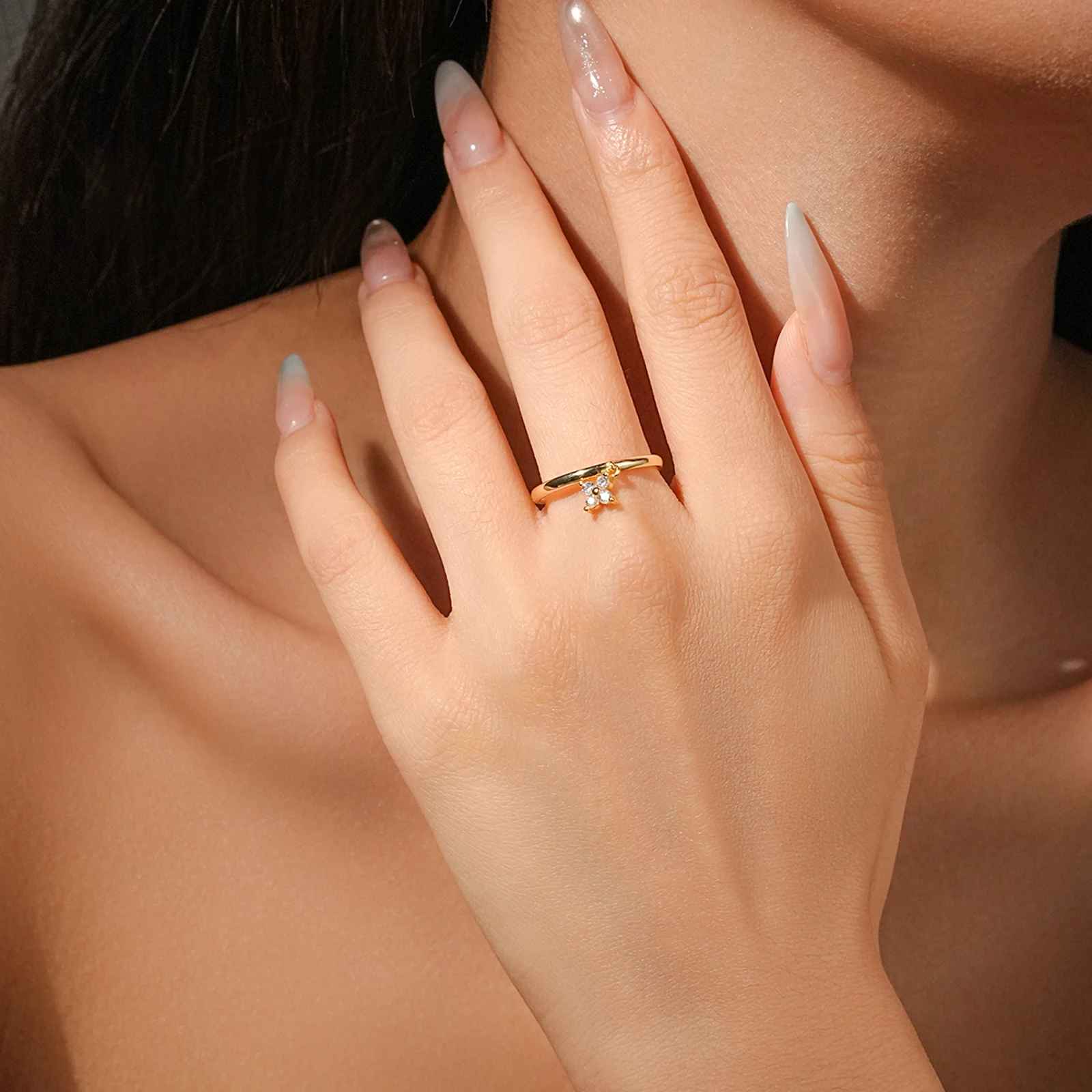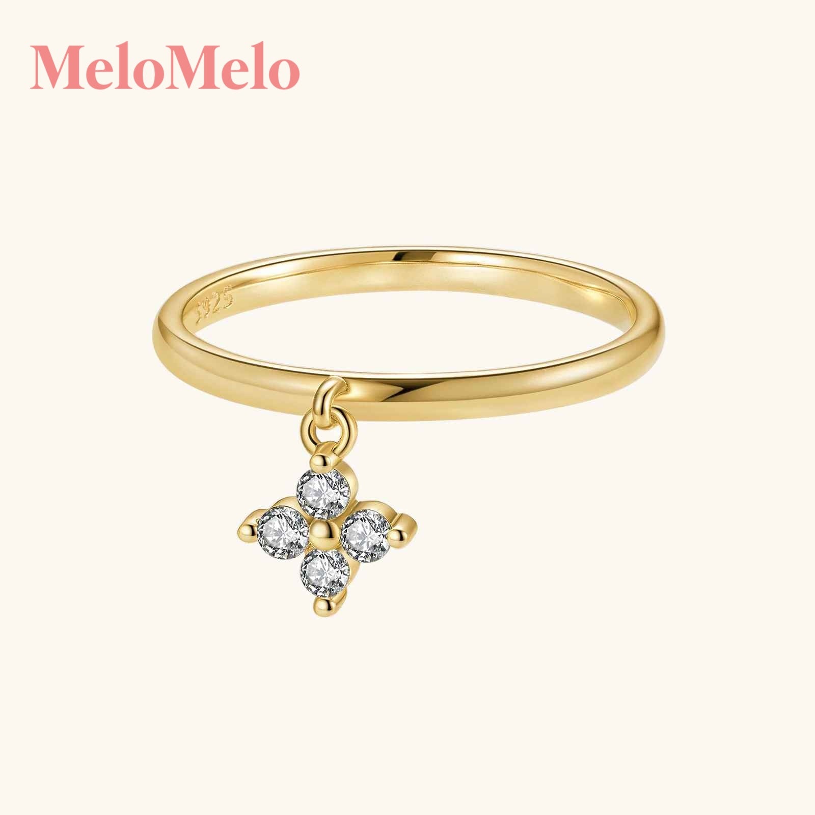 Lumo is a clover dangle charm ring band that blends both such a dainty and graceful look. At it's center, hangs a sparkling clover charm, symbolizing good fortune and luck. Whether as a thoughtful gift or a personal accessory, this ring is pretty and full of luck!