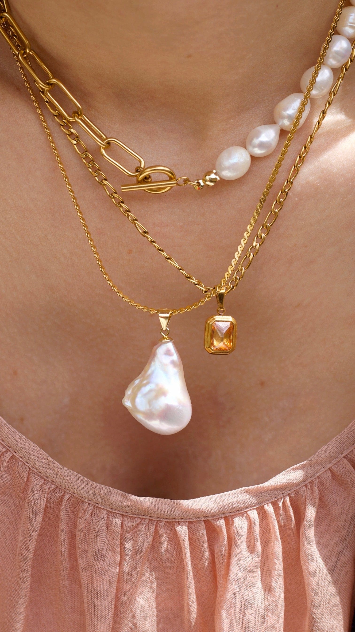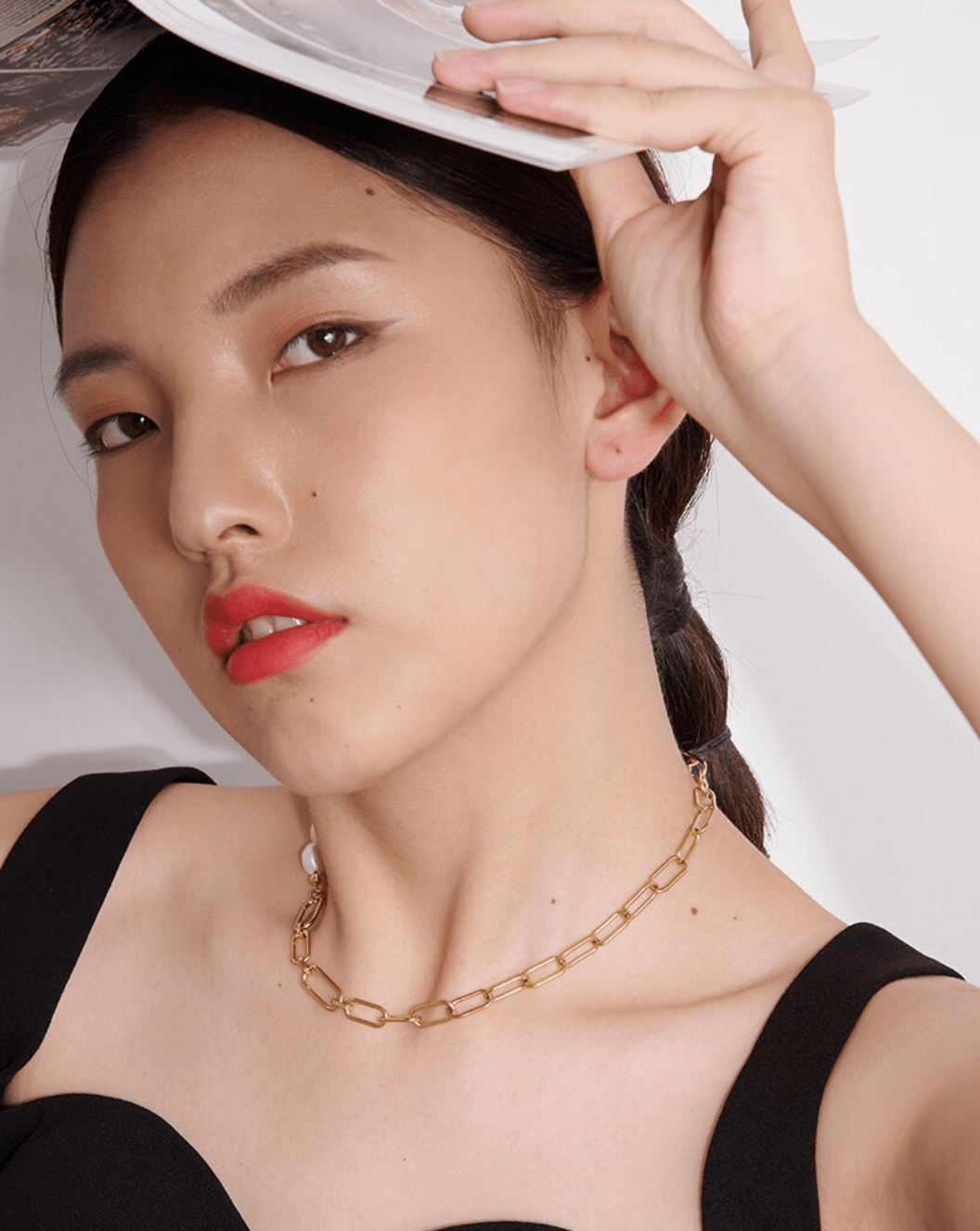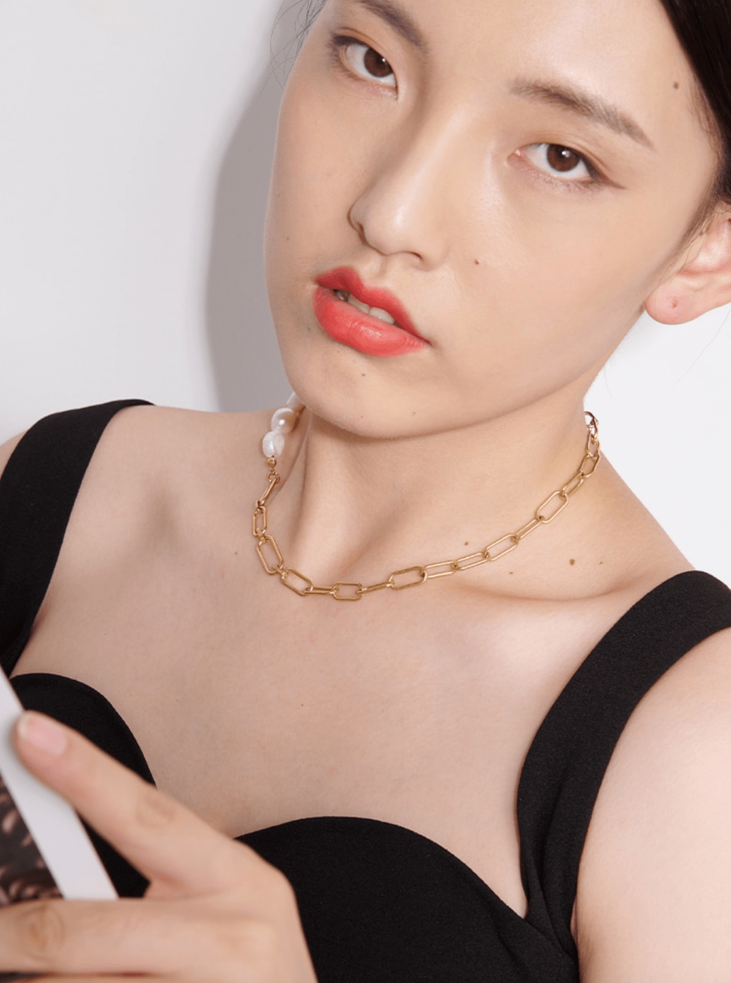 Große Glieder und leuchtende echte Süßwasserperlen verleihen Beaux einen schmeichelhaften Look, wenn sie über dem Hals sitzt, und wirken dabei dennoch kühn.