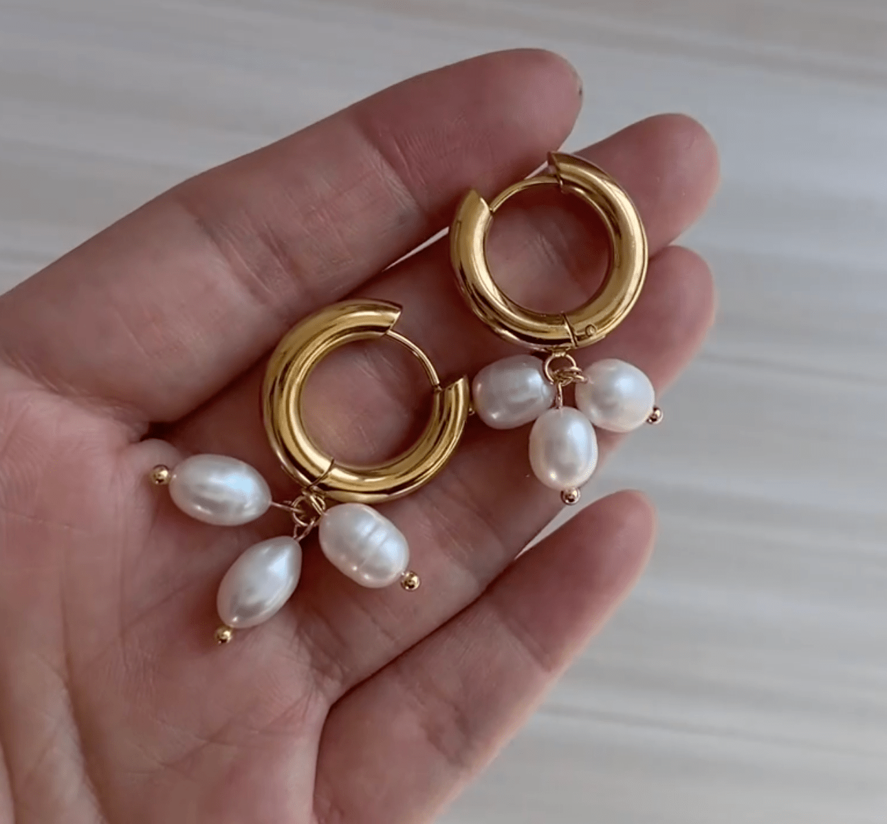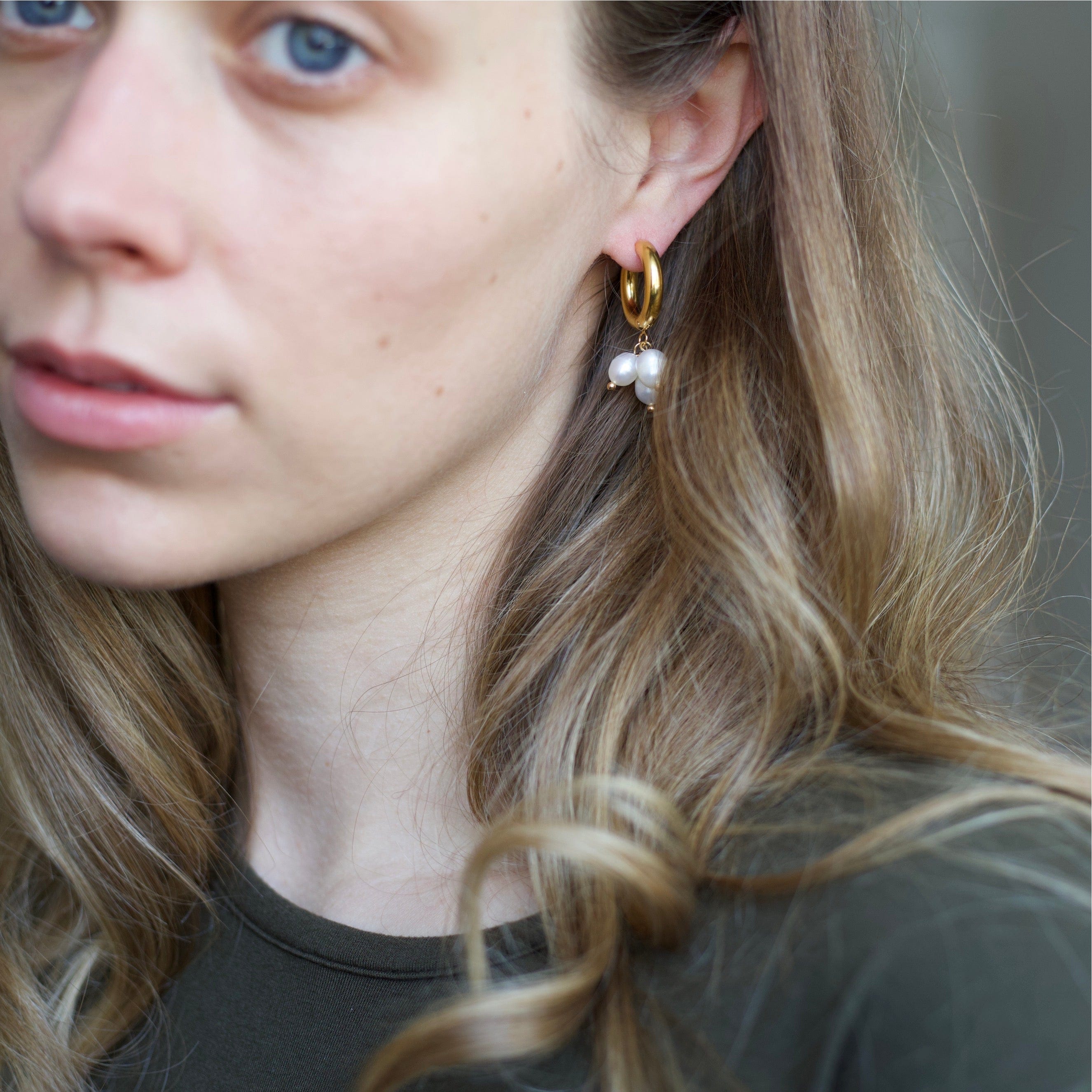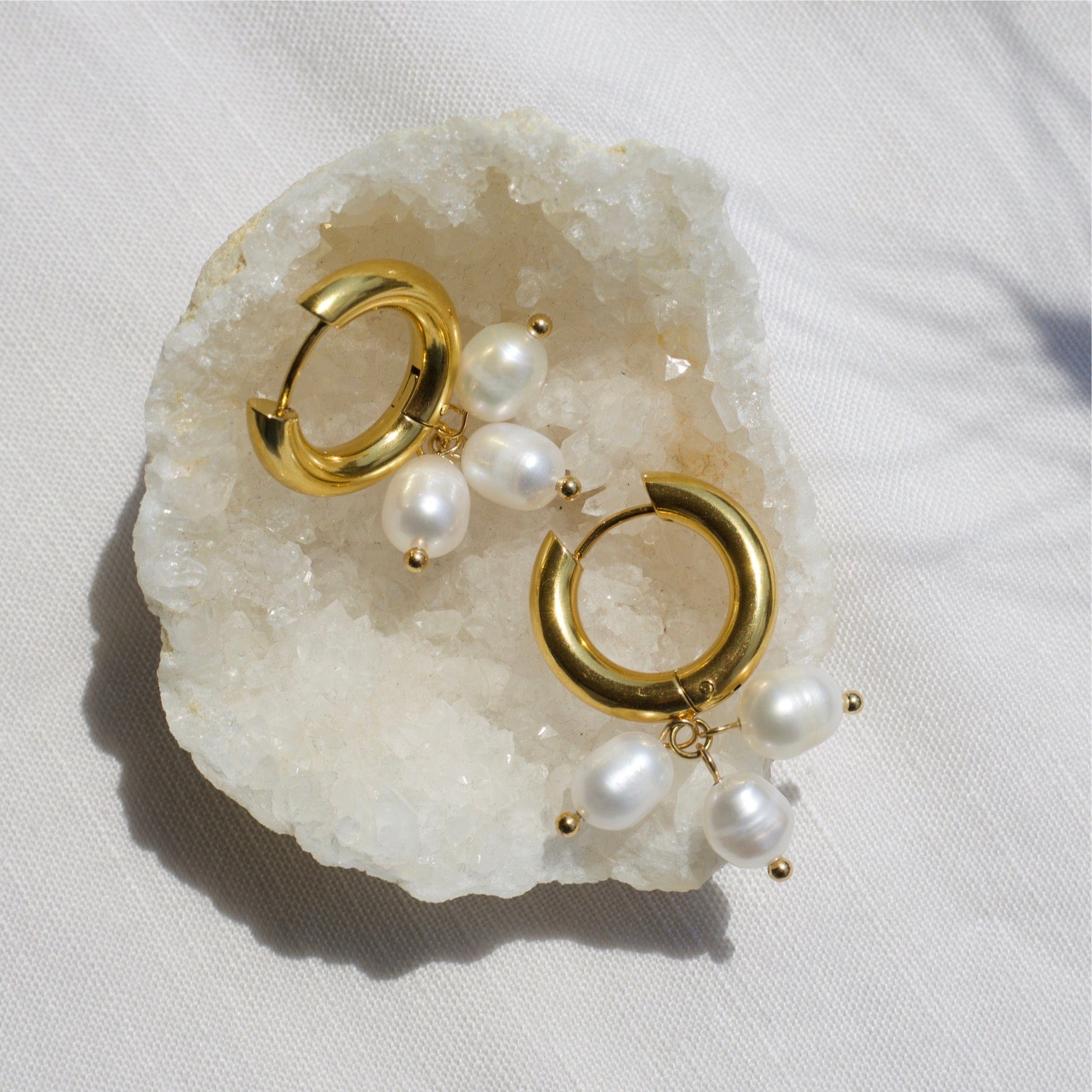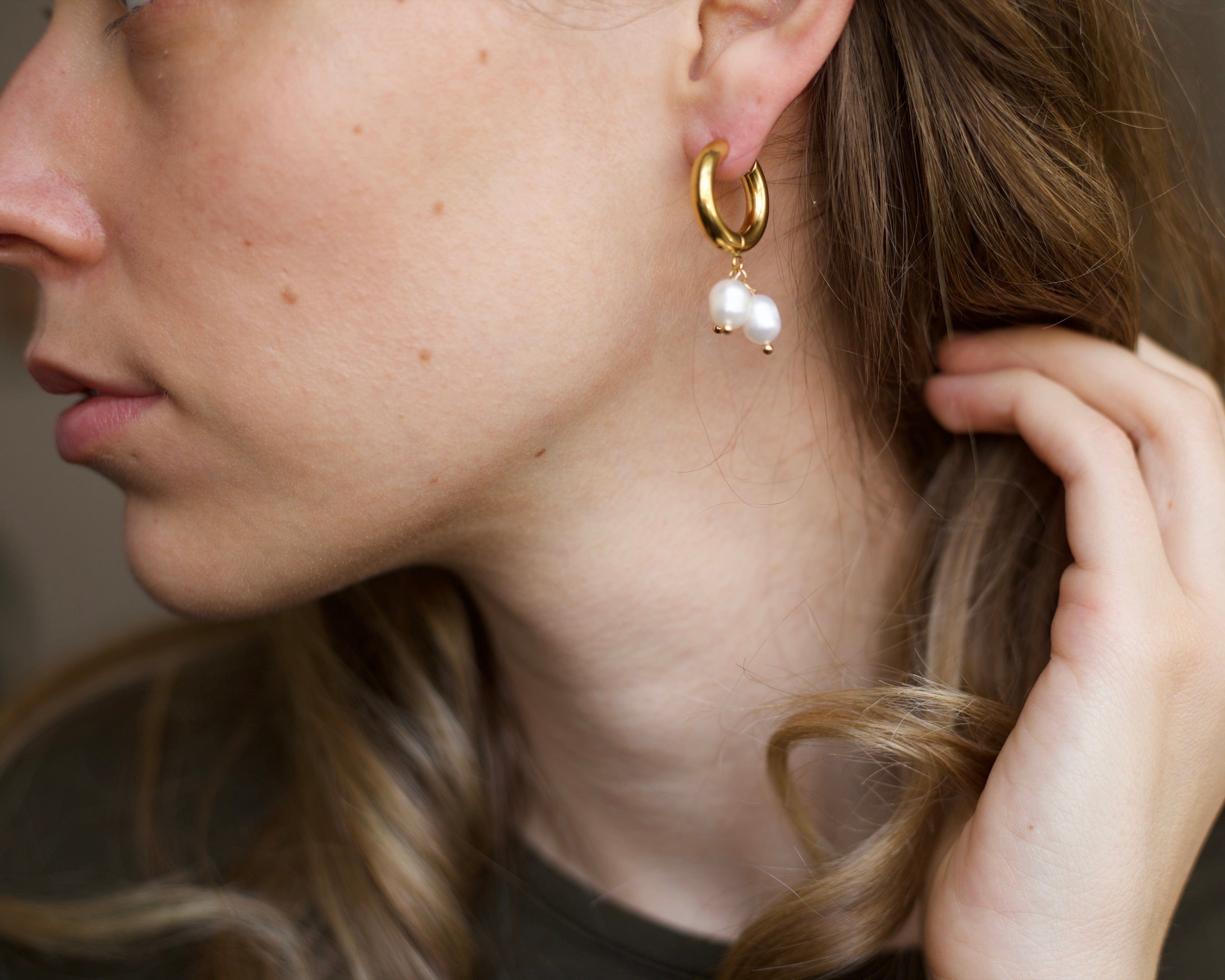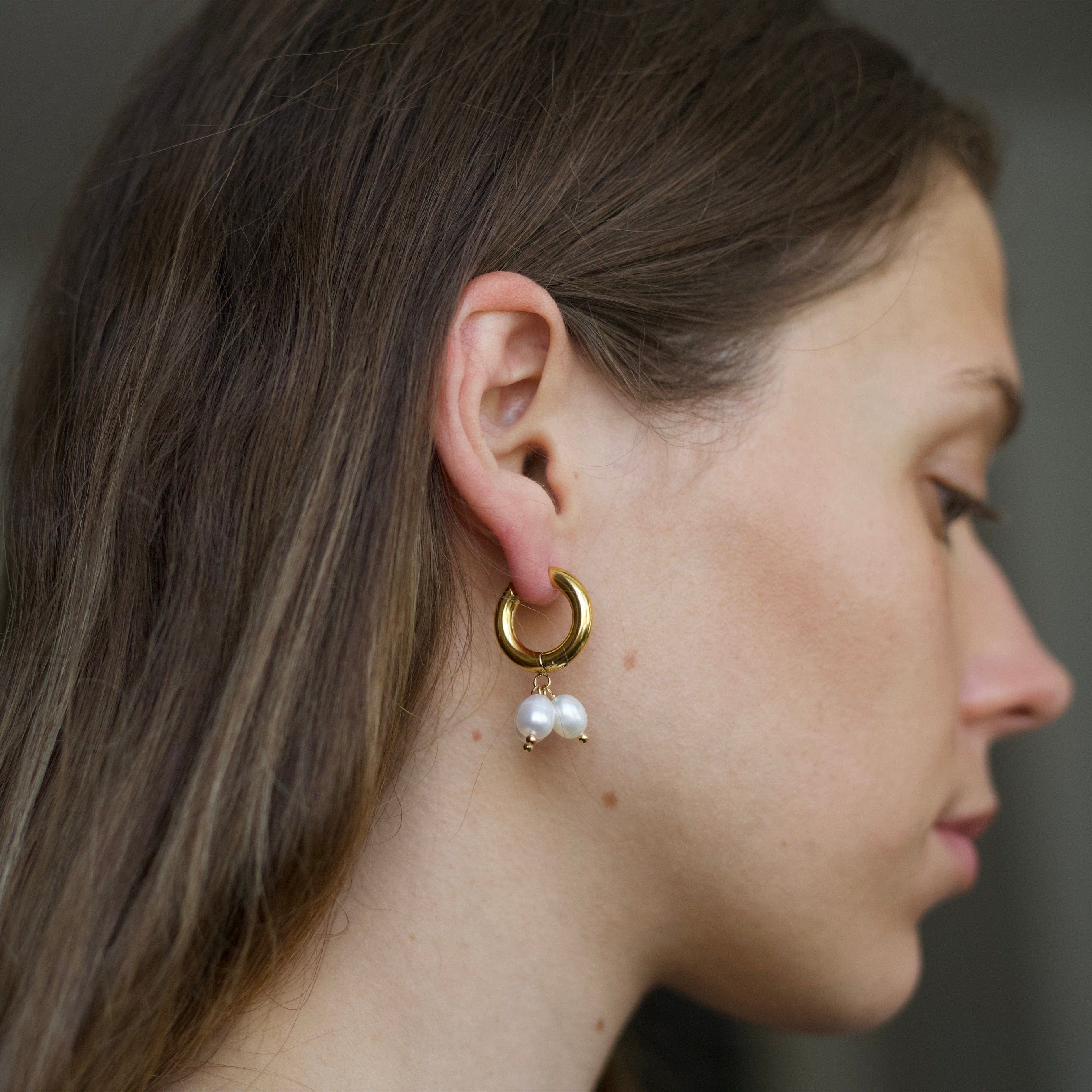 Diese einzigartigen Ohrringe bestehen aus unregelmäßig geformten Perlen mit wunderschönem Perlmutt und Glanz, die an einem klobigen Creolen aus 18-karätigem Gold befestigt sind, mit Hebelverschluss. Dies sind vielseitige Ohrringe, die jedes Outfit verschönern, aber auch zu Ihrer Lieblingsjeans und Ihrem Lieblings-T-Shirt großartig aussehen! Auch perfekt zum Verschenken!