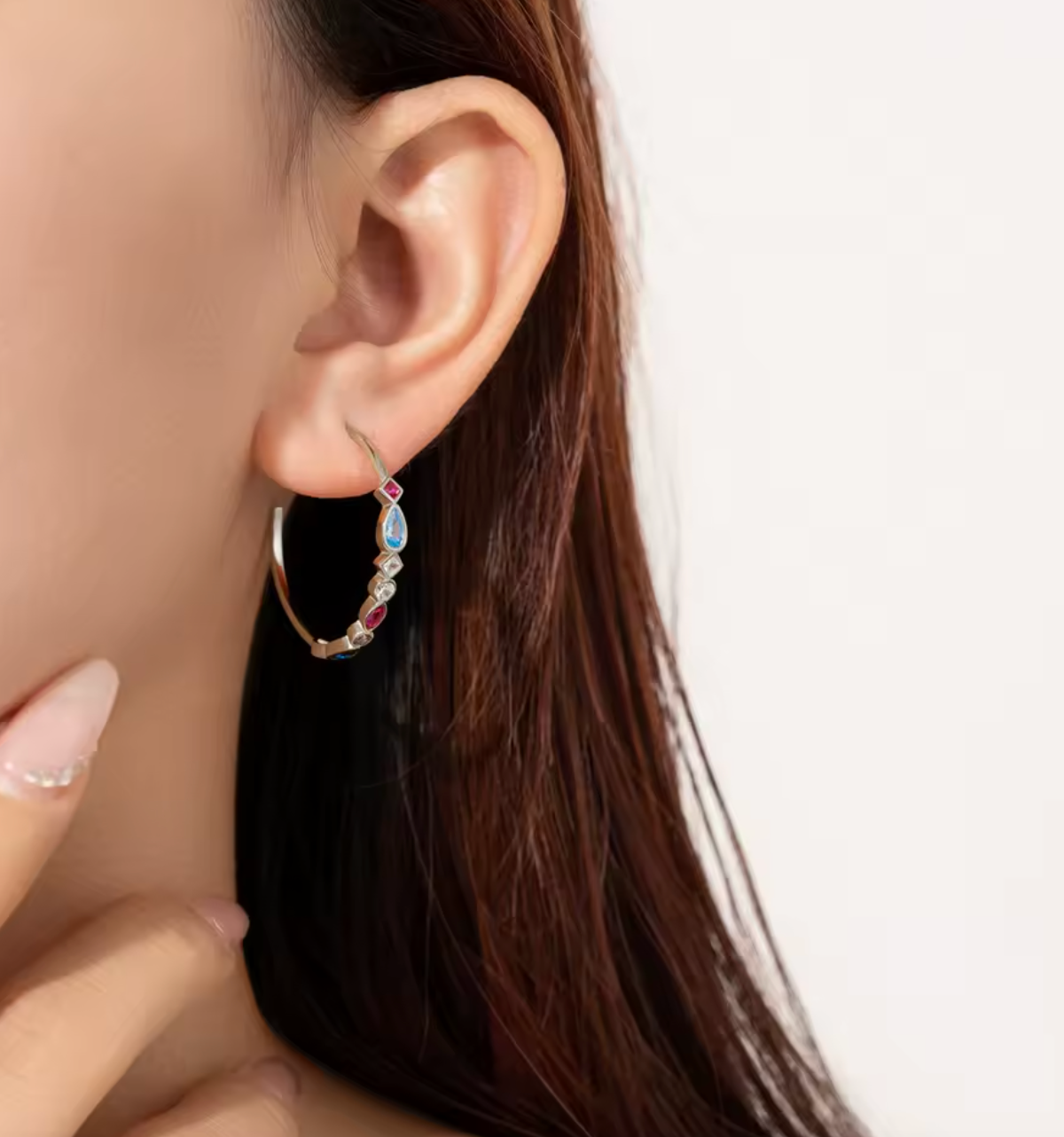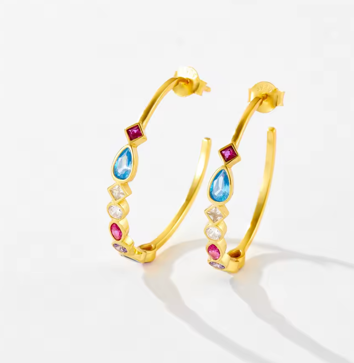 Adorables créoles de grande taille ornées de zirconiums cubiques de différentes tailles et couleurs. Ces boucles d'oreilles présentent de petits zirconiums cubiques rubis, bleus et transparents de tailles variées sur leur face extérieure. Veuillez choisir la couleur du métal souhaitée lors de votre commande. Prix par paire (2 pièces).