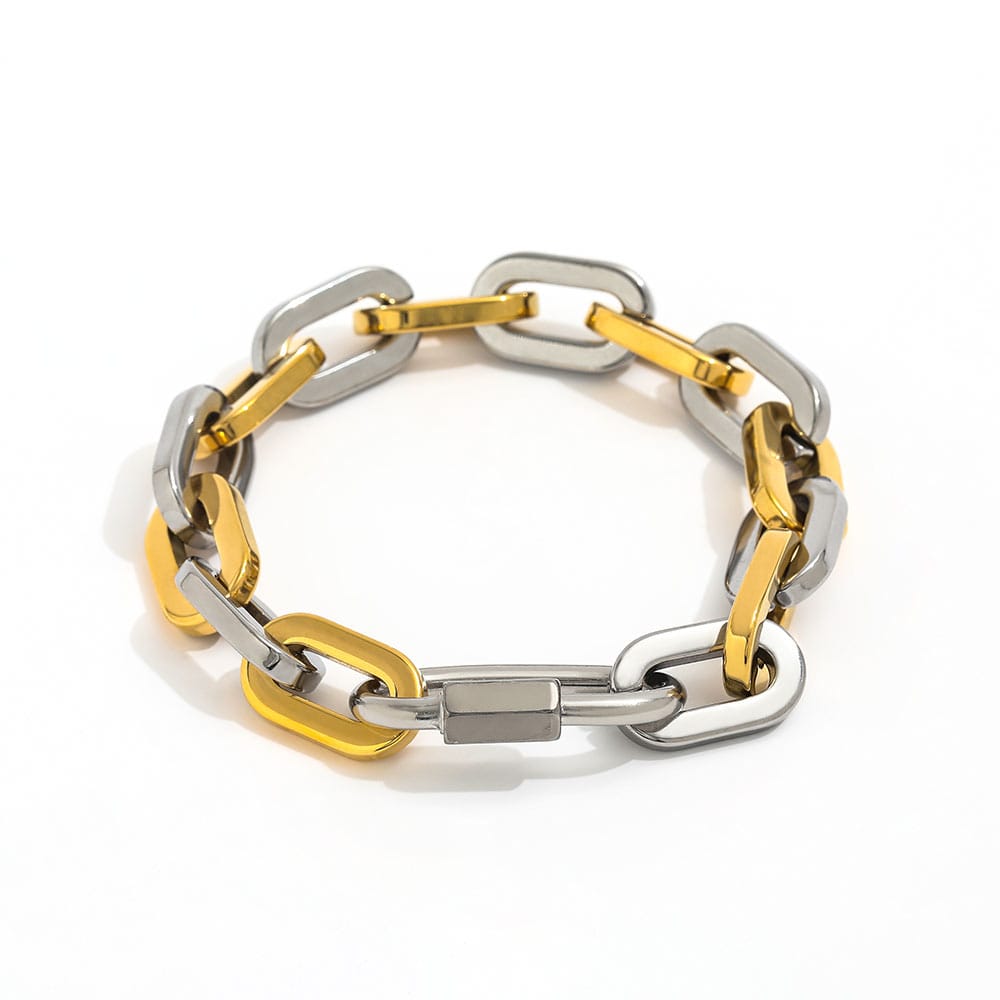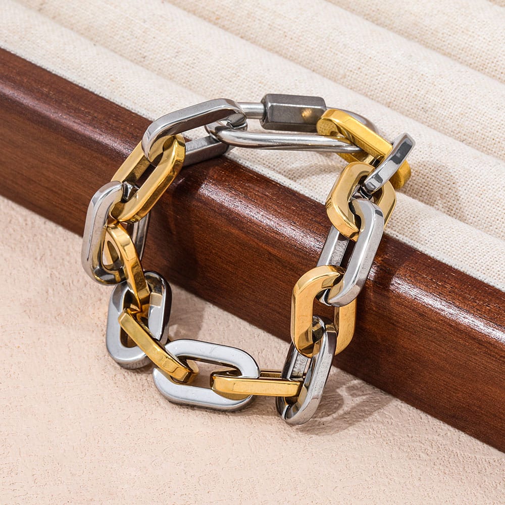 Le bracelet Adeen or et argent est moderne, affirmé et polyvalent. Ce bracelet imposant au style bicolore tendance associe l'éclat de l'or à la sobriété de l'argent. Ses maillons massifs lui confèrent une allure assurée.