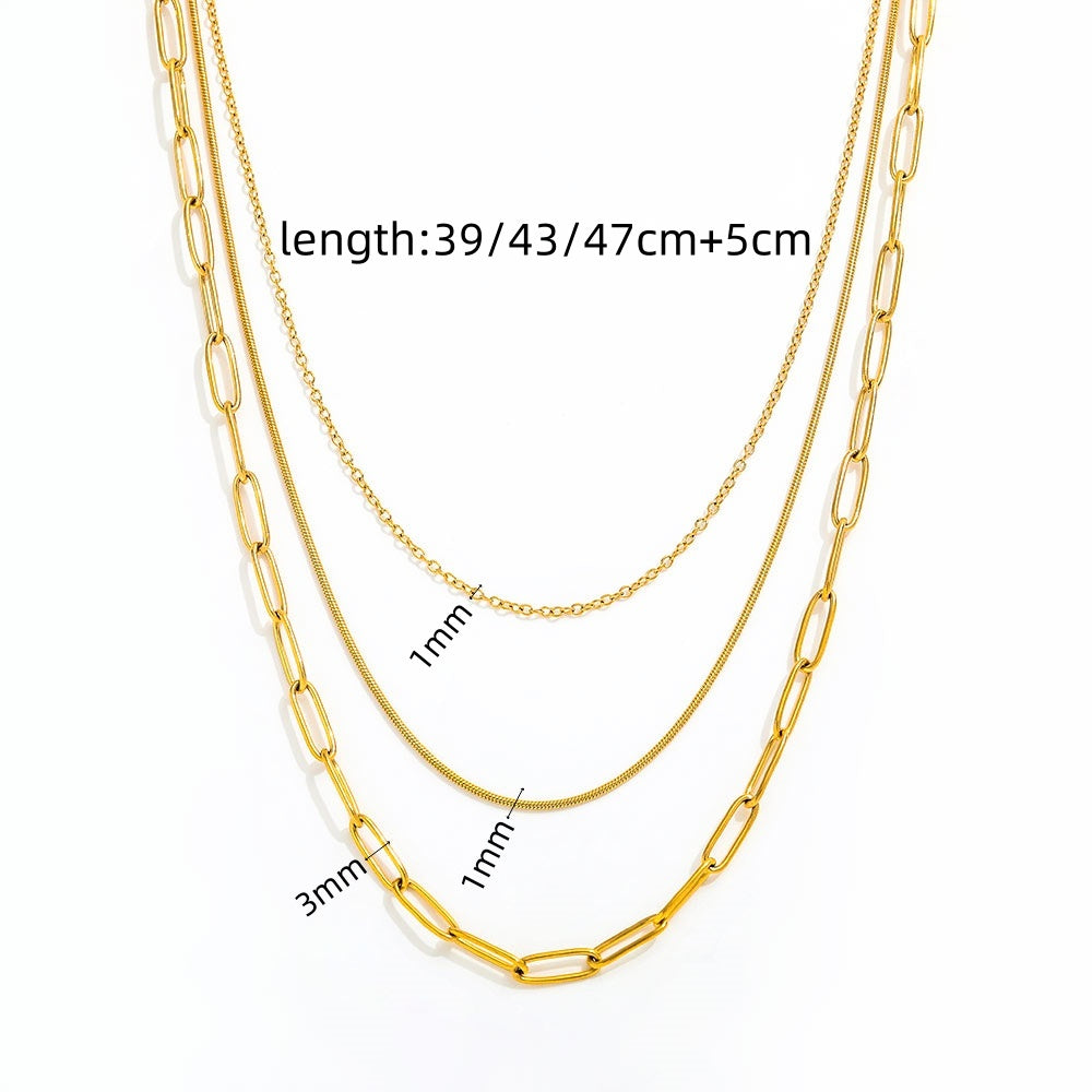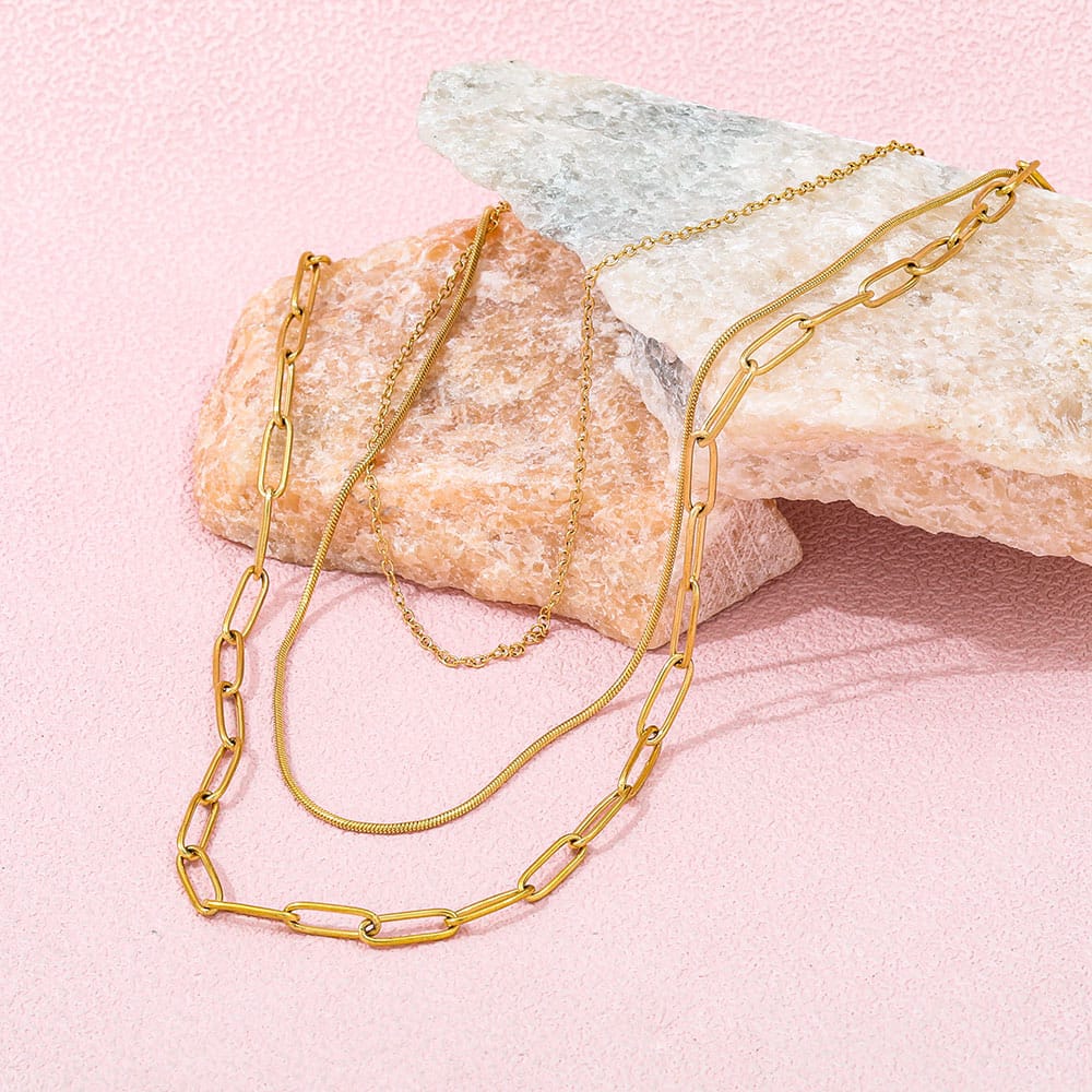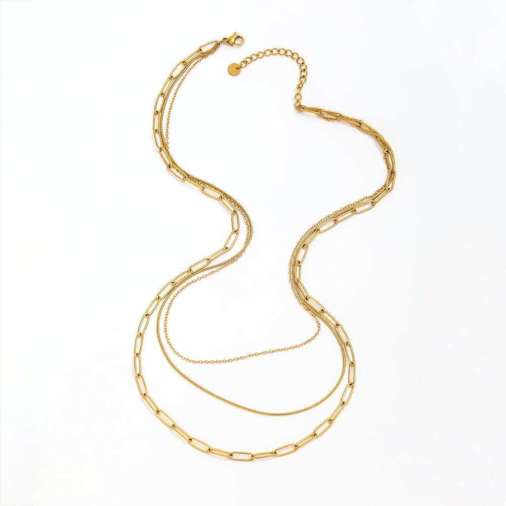Le collier Edana à trois rangs allie un design minimaliste à une fabrication de haute qualité. Élégant et raffiné, ce collier est à la fois robuste et hypoallergénique. Sa structure à trois rangs lui confère un éclat luxueux.