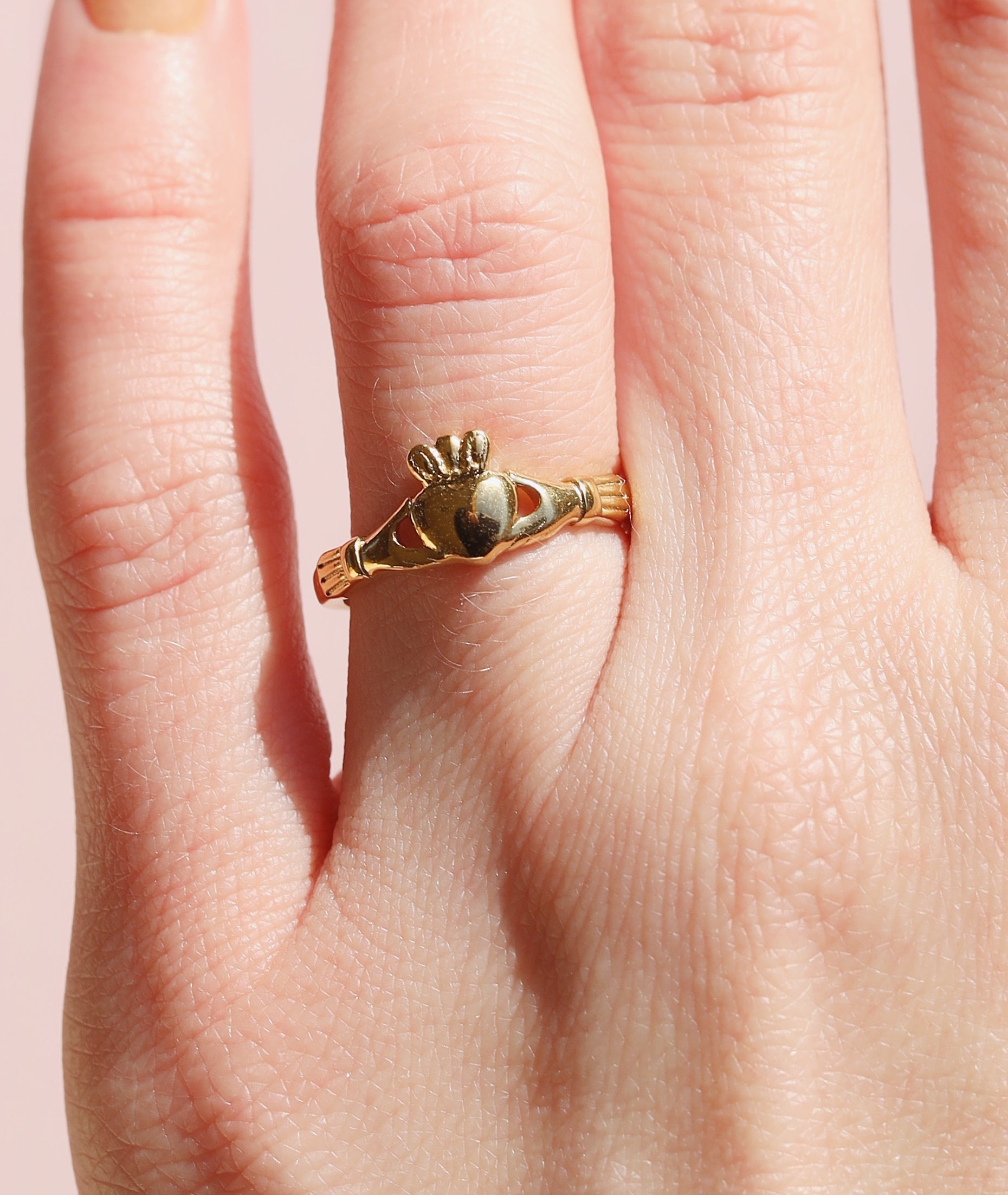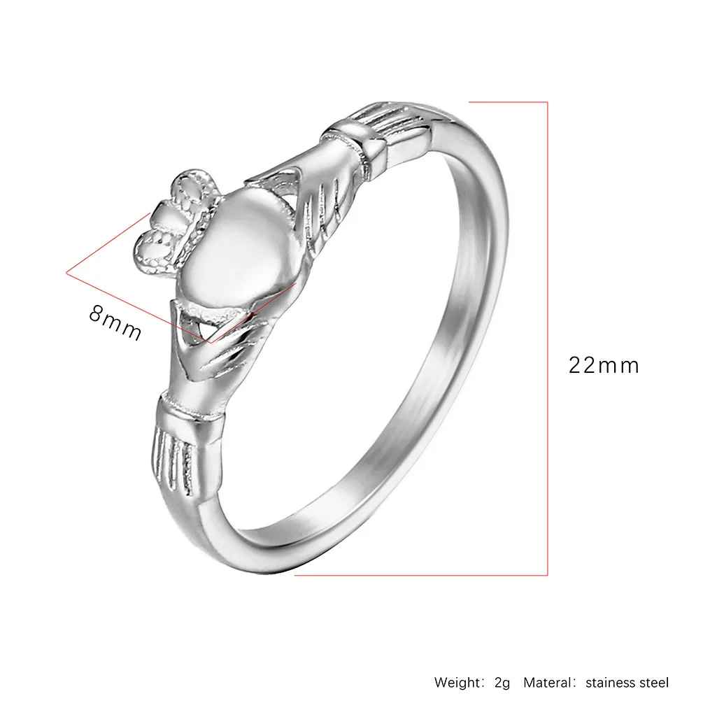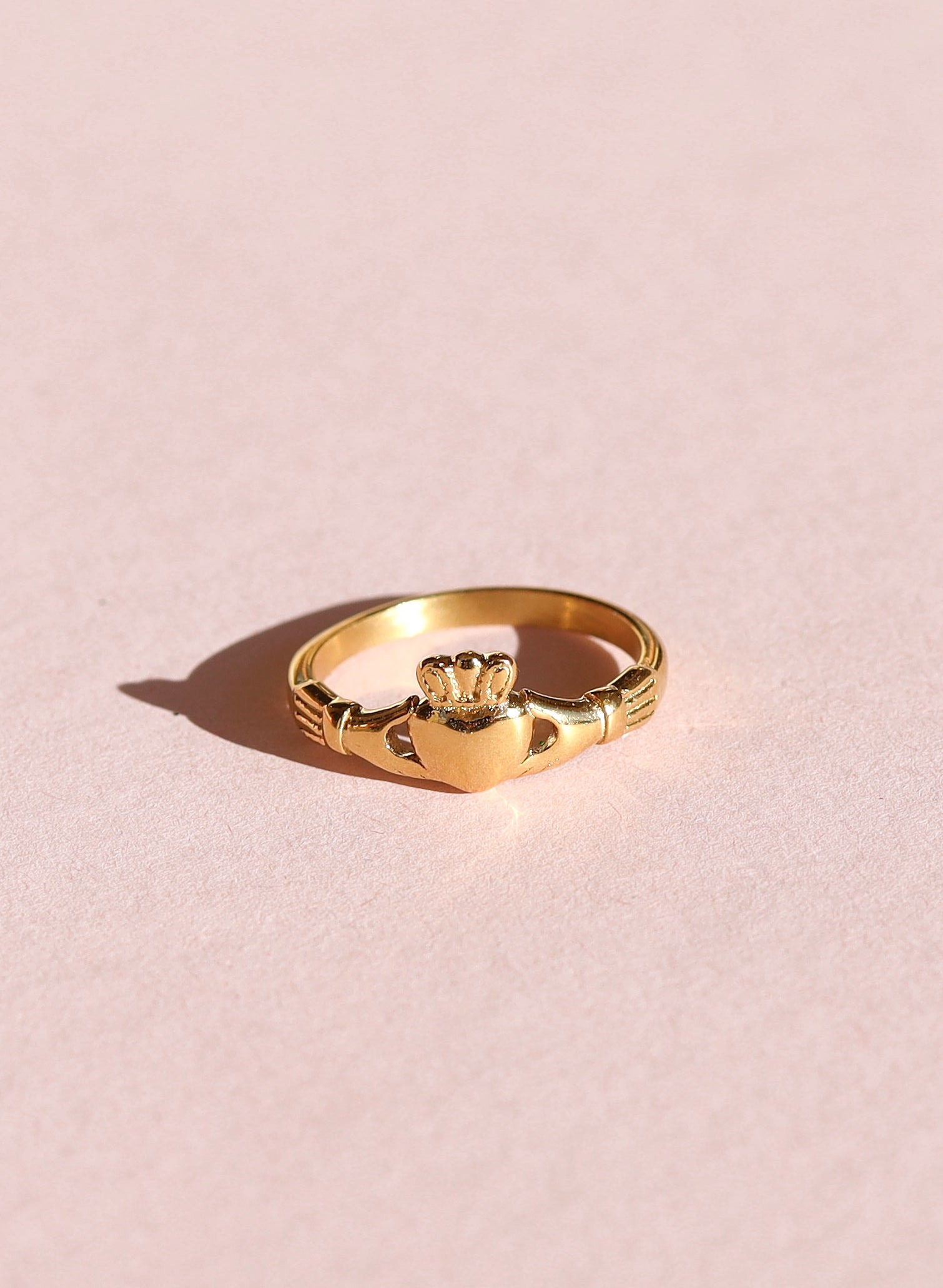 This gold claddagh rin band is a timeless tribute to love, loyalty, and friendship. Crafted with the traditional claddagh design, this ring symbolizes the enduring bond between two individuals. This is a 18k gold PVD, tarnish-free ring which is a meaningful piece of jewelry to commemorate a special relationship.