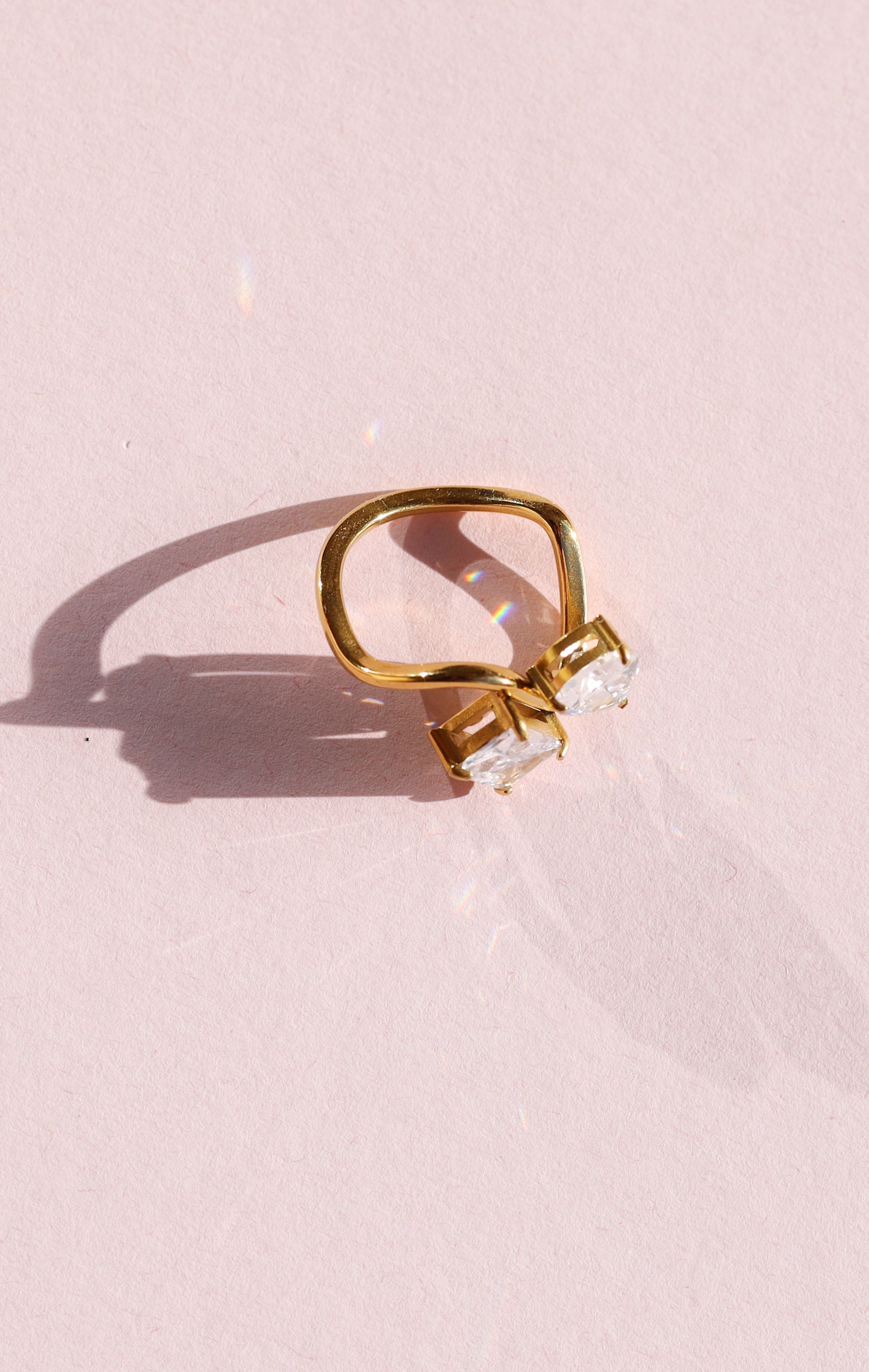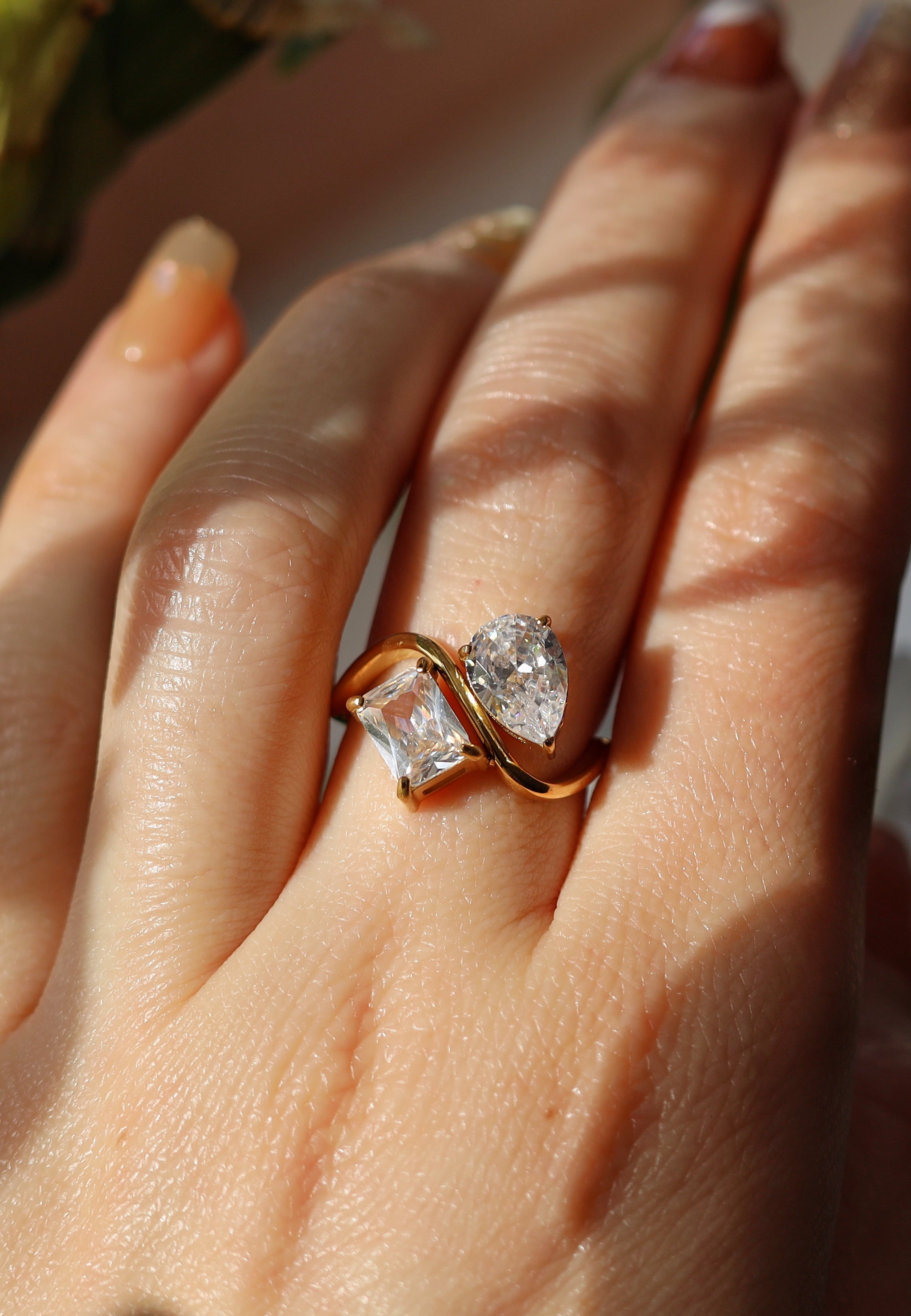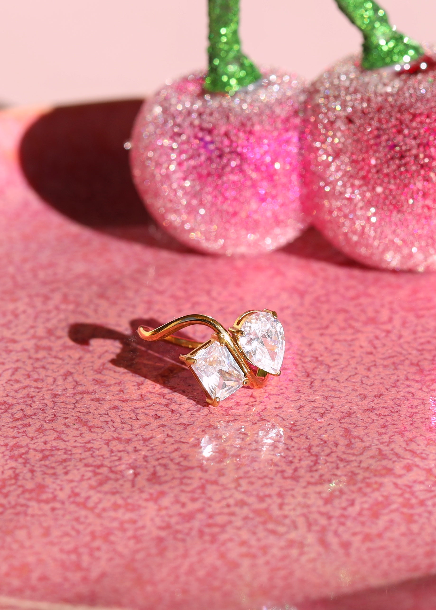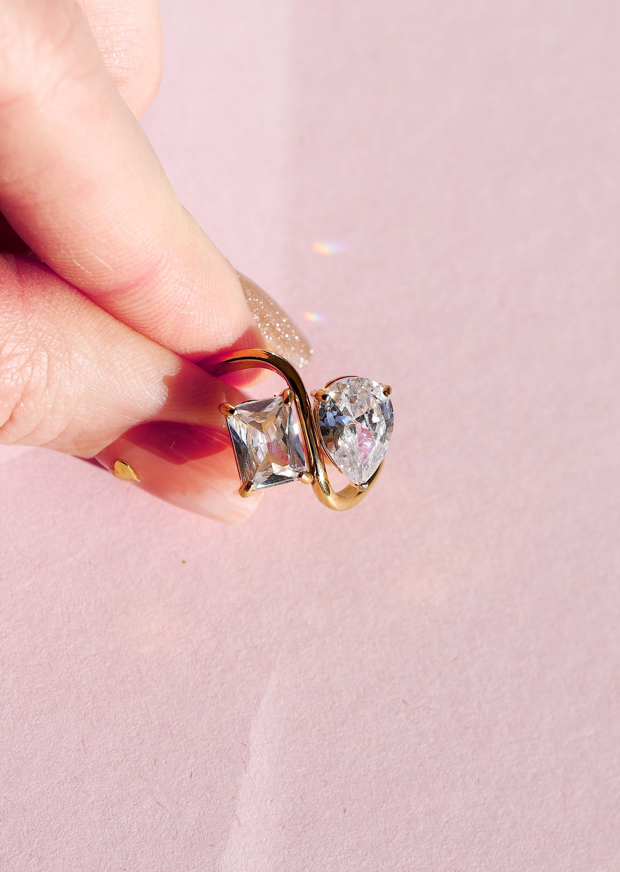 A gleaming duo of crystals takes center stage on this Pear Shaped Engagement Ring in Gold ! Perfect for elegant events and casual-chic grab-and-go.